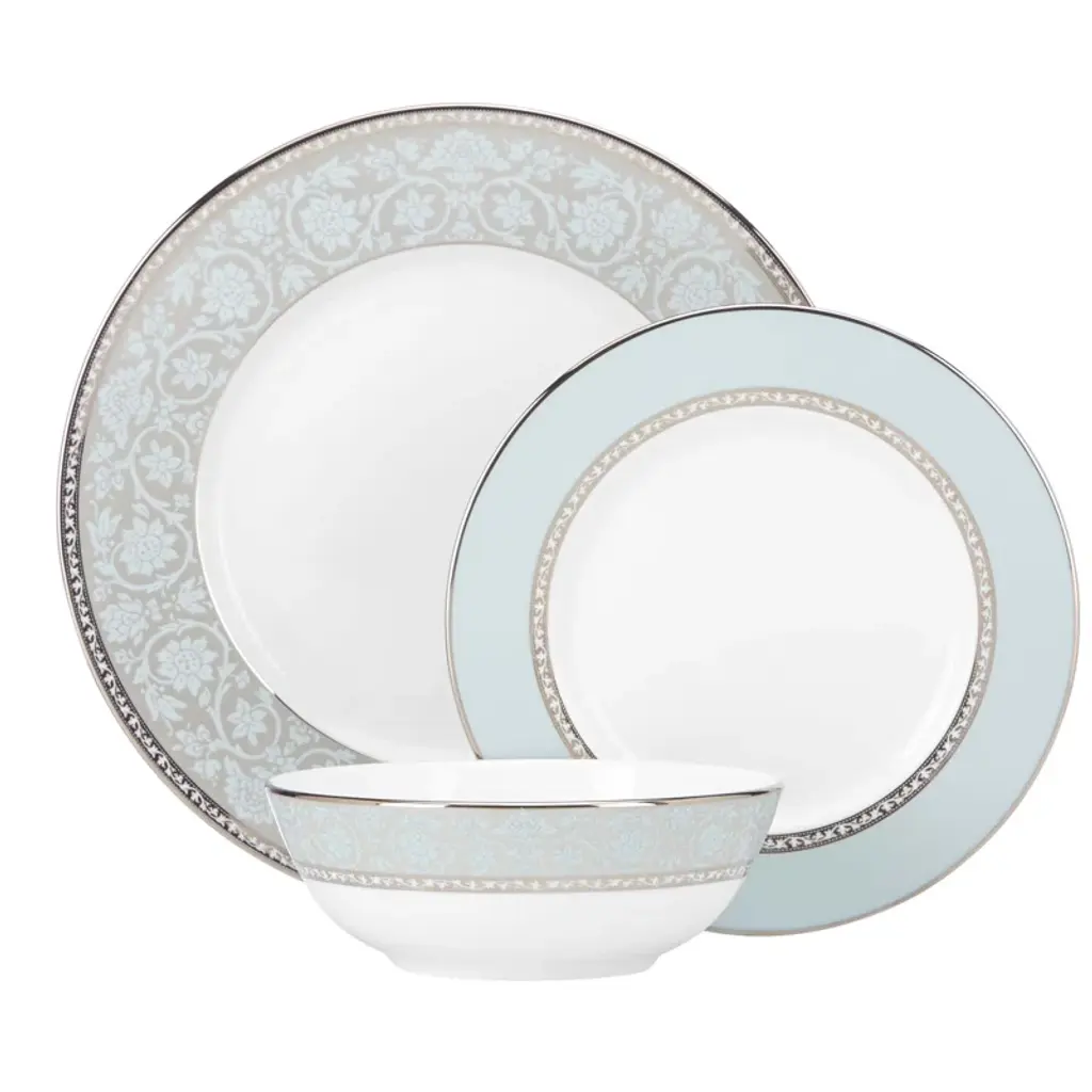 A wide border of blooming botanicals is artfully enhanced by crisp accents of polished platinum in this refined dinnerware collection from Lenox.