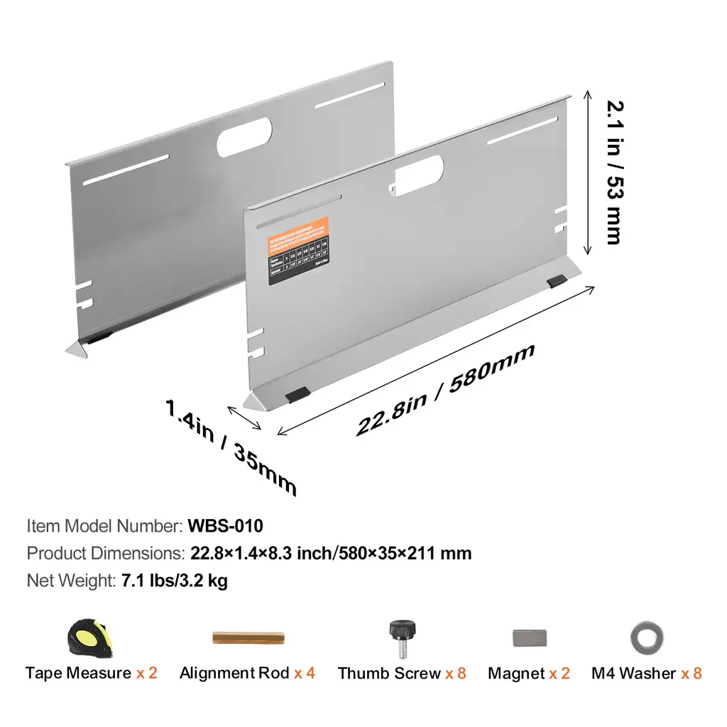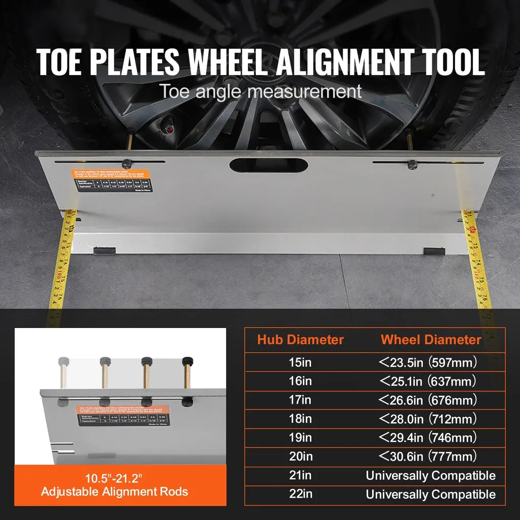 Precision Toe Angle Measurement: No tire removal is required. Measure the toe angle on the hub directly with our adjustable alignment rods (10.5"-21.2"). This measurement method minimizes inaccuracies caused by tire bumps or sidewall inscriptions. Included two 5m tape measures with precise 1/32" increments and professional guidance for effortless operation. Magnetic Slot Design: Our toe plates feature magnetic slots that firmly hold the measuring tape head in place. This design prevents the tape from falling or shifting during solo measurements, increasing your measurement success rate and enabling efficient single-person operation. All-Steel Plates: Our toe alignment tool is upgraded from traditional aluminum to thick stainless steel for enhanced durability. The high hardness nature of stainless steel prevents deformation and enhances rust resistance, significantly increasing the alignment plates' longevity and reliability. Stable Non-slip Base: Benefit from increased stability during measurements with our toe alignment tool's triangular base design, complemented by non-slip rubber elements. This design prevents shaking and instability, ensuring precise results. Vehicle Compatibility: The wheel alignment tool is suitable for a wide range of vehicles, including sedans, SUVs, and pickup trucks. Compatible hub sizes: 15 in hubs (wheel diameter<23.5 in/597 mm), 16 in hubs (wheel diameter<25.1 in/637 mm), 17 in hubs (wheel diameter<26.6 in/676 mm), 18 in hubs (wheel diameter<28.0 in/712 mm), 19 in hubs (wheel diameter<29.4 in/746 mm), 20 in hubs (wheel diameter<30.6 in/777 mm), 21 in hubs (all applicable), 22 in hubs (all applicable). Package Content 2 x Toe Plates 2 x Tape Measures 4 x Alignment Rods 8 x Thumb Screw 2 x Magnet (with 3M Adhesive) 8 x M4 Washers