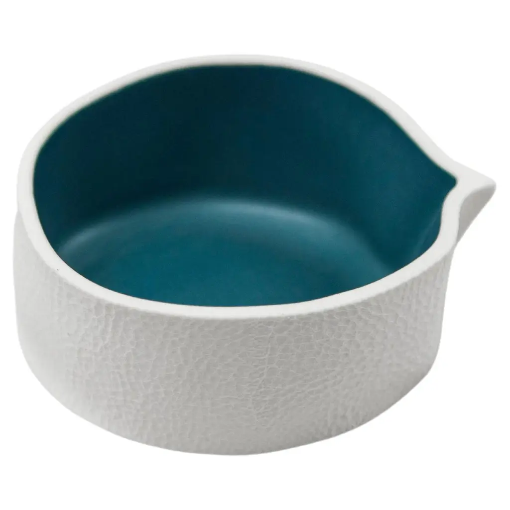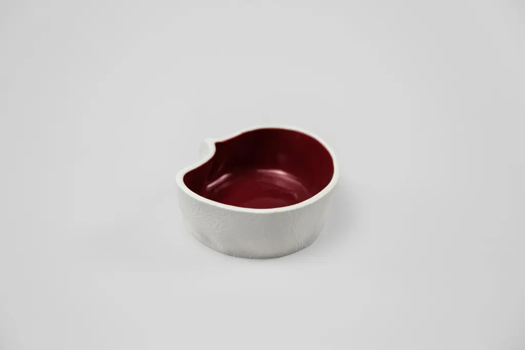 An organic shaped porcelain bowl with a tactile exterior surface and a smooth glazed interior. Small & precious, yet surprisingly practical, the Kawa Dishes are equally well-suited as a jewelry dish, salt cellar, sauces & dips bowl. As a result of the production process each vase is one-of-a-kind. All finishes are food-safe and dishwasher-safe.Dimensions3.5" diameter x 1.5" height.Made to order. Signed and dated.The Kawa Series is a collection of porcelain objects that are made by casting liquid clay into sewn leather molds. The precarious and beautifully-involved process is completely unique to Luft Tanaka Studio, and results in truly one-of-a-kind art objects. All pieces are handmade in Brooklyn at Luft Tanaka Studio.Each Kawa piece starts as a sketch on paper. With the assistance of a 3-D modeling program, Luft creates patterns to be cut out of leather. After the leather mold, which can be reused about a dozen times, is sewn and prepared, liquid porcelain is poured inside. As the porcelain sits inside the mold, it forms a thin wall along the leather surface picking up the leather texture and organic form from the flexible leather mold. Once dry, the leather mold is carefully cut open using a seam ripper and delicately peeled off the piece which is then carefully finished by hand.