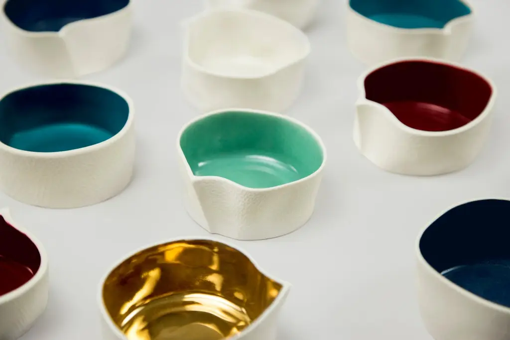 An organic shaped porcelain bowl with a tactile exterior surface and a smooth glazed interior. Small & precious, yet surprisingly practical, the Kawa Dishes are equally well-suited as a jewelry dish, salt cellar, sauces & dips bowl. As a result of the production process each vase is one-of-a-kind. All finishes are food-safe and dishwasher-safe.Dimensions3.5" diameter x 1.5" heightMade to order. Signed and dated.The Kawa Series is a collection of porcelain objects that are made by casting liquid clay into sewn leather molds. The precarious and beautifully-involved process is completely unique to Luft Tanaka Studio, and results in truly one-of-a-kind art objects. All pieces are handmade in Brooklyn at Luft Tanaka Studio.Each Kawa piece starts as a sketch on paper. With the assistance of a 3-D modeling program, Luft creates patterns to be cut out of leather. After the leather mold, which can be reused about a dozen times, is sewn and prepared, liquid porcelain is poured inside. As the porcelain sits inside the mold, it forms a thin wall along the leather surface picking up the leather texture and organic form from the flexible leather mold. Once dry, the leather mold is carefully cut open using a seam ripper and delicately peeled off the piece which is then carefully finished by hand.