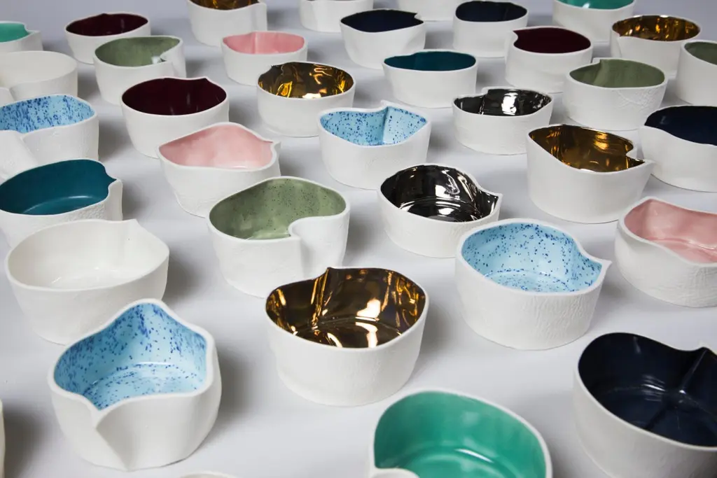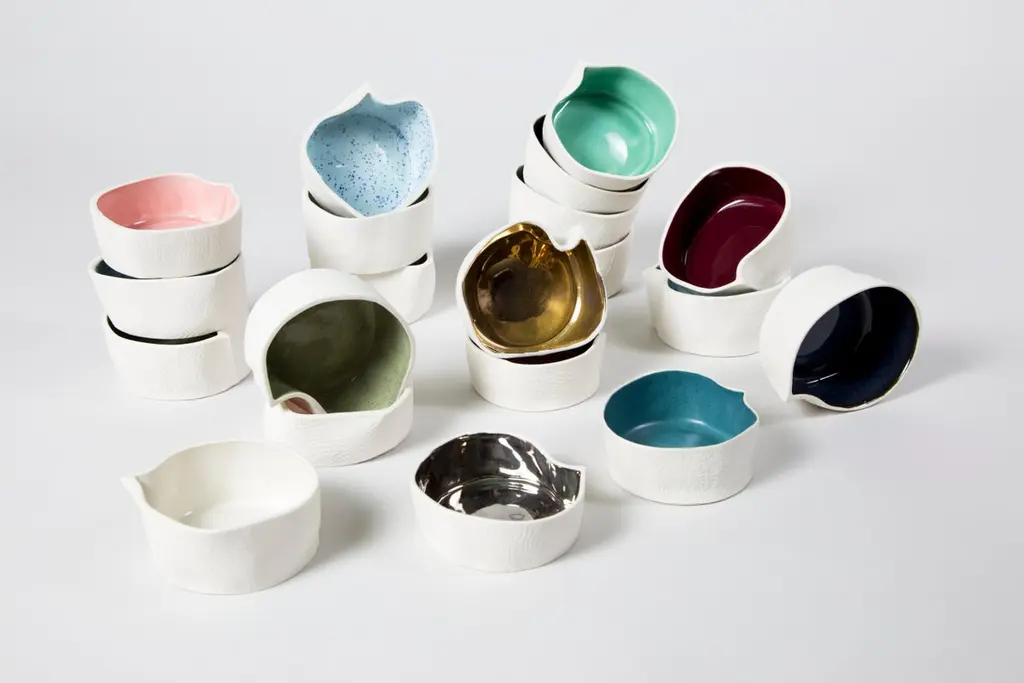 An organic shaped porcelain bowl with a tactile exterior surface and a smooth glazed interior. Small & precious, yet surprisingly practical, the Kawa Dishes are equally well-suited as a jewelry dish, salt cellar, sauces & dips bowl. As a result of the production process each vase is one-of-a-kind. All finishes are food-safe and dishwasher-safe.Dimensions3.5" diameter x 1.5" heightMade to order. Signed and dated.The Kawa Series is a collection of porcelain objects that are made by casting liquid clay into sewn leather molds. The precarious and beautifully-involved process is completely unique to Luft Tanaka Studio, and results in truly one-of-a-kind art objects. All pieces are handmade in Brooklyn at Luft Tanaka Studio.Each Kawa piece starts as a sketch on paper. With the assistance of a 3-D modeling program, Luft creates patterns to be cut out of leather. After the leather mold, which can be reused about a dozen times, is sewn and prepared, liquid porcelain is poured inside. As the porcelain sits inside the mold, it forms a thin wall along the leather surface picking up the leather texture and organic form from the flexible leather mold. Once dry, the leather mold is carefully cut open using a seam ripper and delicately peeled off the piece which is then carefully finished by hand.