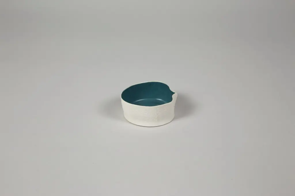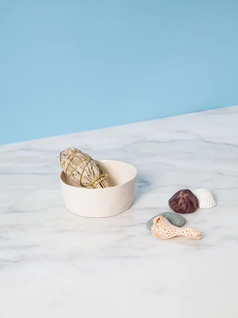 An organic shaped porcelain bowl with a tactile exterior surface and a smooth glazed interior. Small & precious, yet surprisingly practical, the Kawa Dishes are equally well-suited as a jewelry dish, salt cellar, sauces & dips bowl. As a result of the production process each vase is one-of-a-kind. All finishes are food-safe and dishwasher-safe.Dimensions3.5" diameter x 1.5" height.Made to order. Signed and dated.The Kawa Series is a collection of porcelain objects that are made by casting liquid clay into sewn leather molds. The precarious and beautifully-involved process is completely unique to Luft Tanaka Studio, and results in truly one-of-a-kind art objects. All pieces are handmade in Brooklyn at Luft Tanaka Studio.Each Kawa piece starts as a sketch on paper. With the assistance of a 3-D modeling program, Luft creates patterns to be cut out of leather. After the leather mold, which can be reused about a dozen times, is sewn and prepared, liquid porcelain is poured inside. As the porcelain sits inside the mold, it forms a thin wall along the leather surface picking up the leather texture and organic form from the flexible leather mold. Once dry, the leather mold is carefully cut open using a seam ripper and delicately peeled off the piece which is then carefully finished by hand.