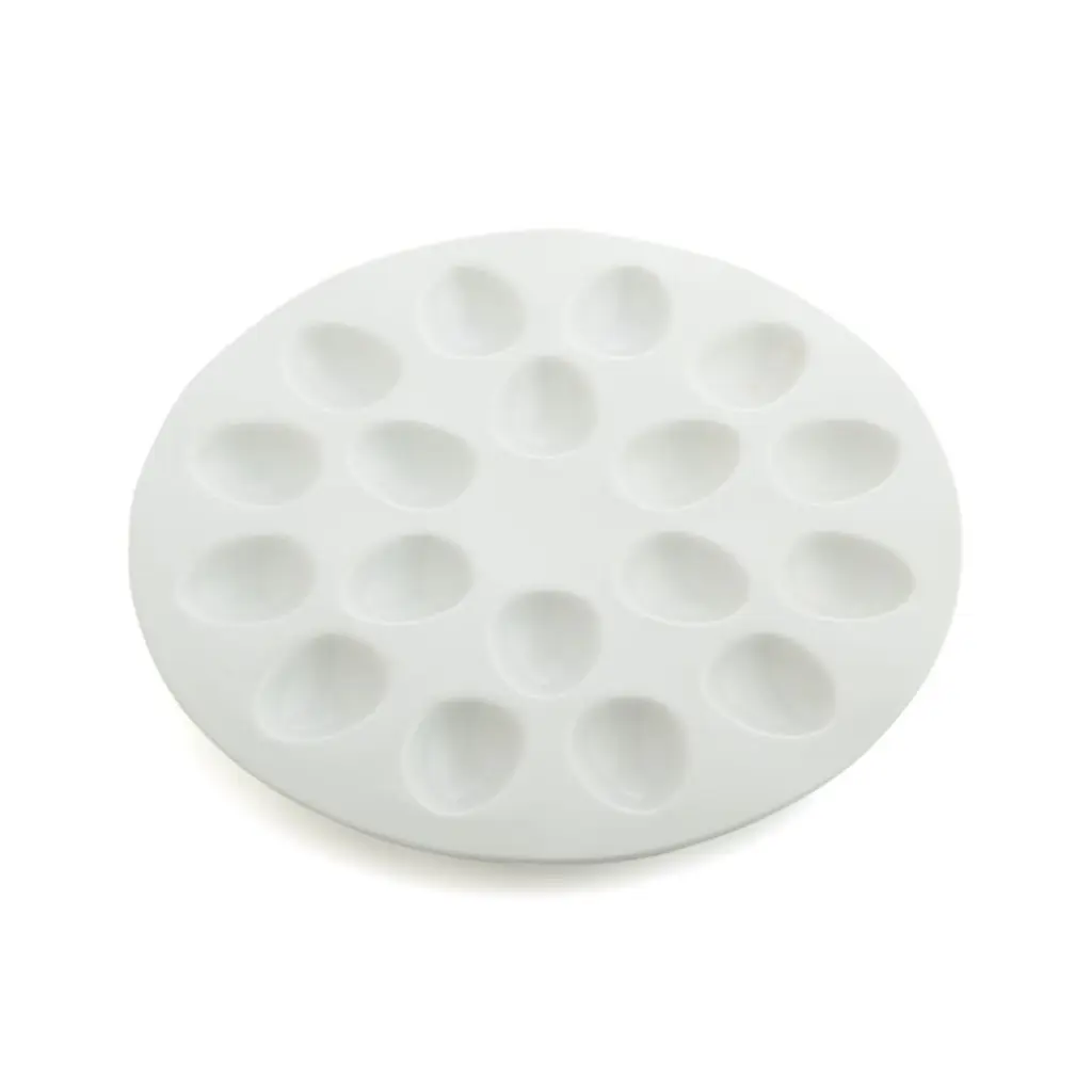 Egg-shaped indentations fan out in a floral shape on this white porcelain round egg platter, showcasing hard-boiled or deviled eggs for brunches, buffets, barbecues and Easter displays.