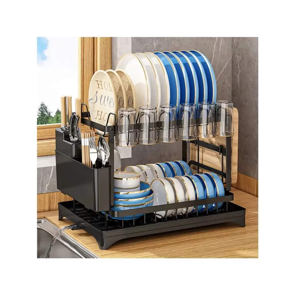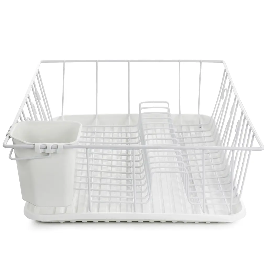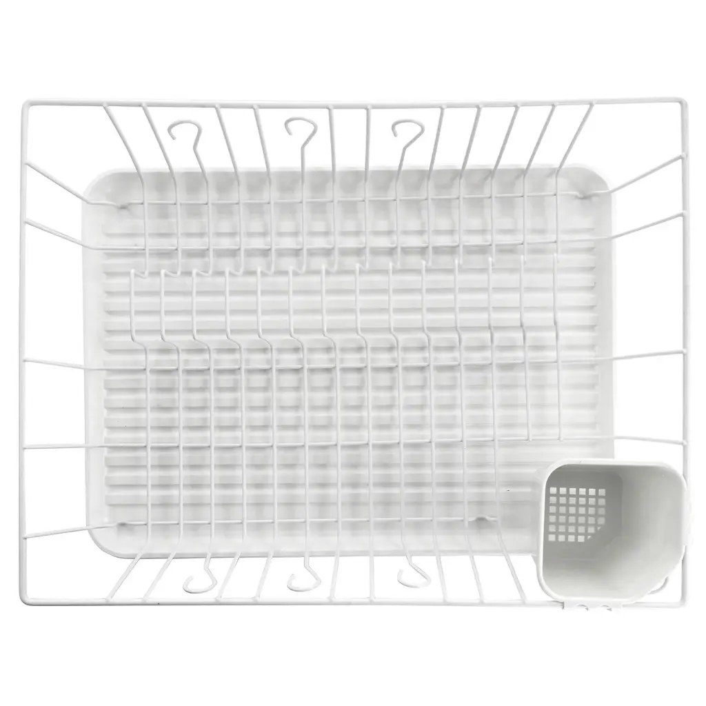 Simplify the task of drying your dishes with this fantastic Dish Rack! This rack holds all your hand-washables so drying is organized and efficient. This rack features a utensil holder, plastic draining tray, slots for plates and space for cups and bowls. Made of iron wire White color powder coated Includes one dish rack Includes one indented plastic draining tray to keep the water away from your dishes and off your counters Includes one plastic utensil holder 17.5" Long x 13.5" Wide 6 Special cup hooks for more efficient space utilization 3.5" x 3.5" Detachable Utensil Holder 14 Raised plate holders