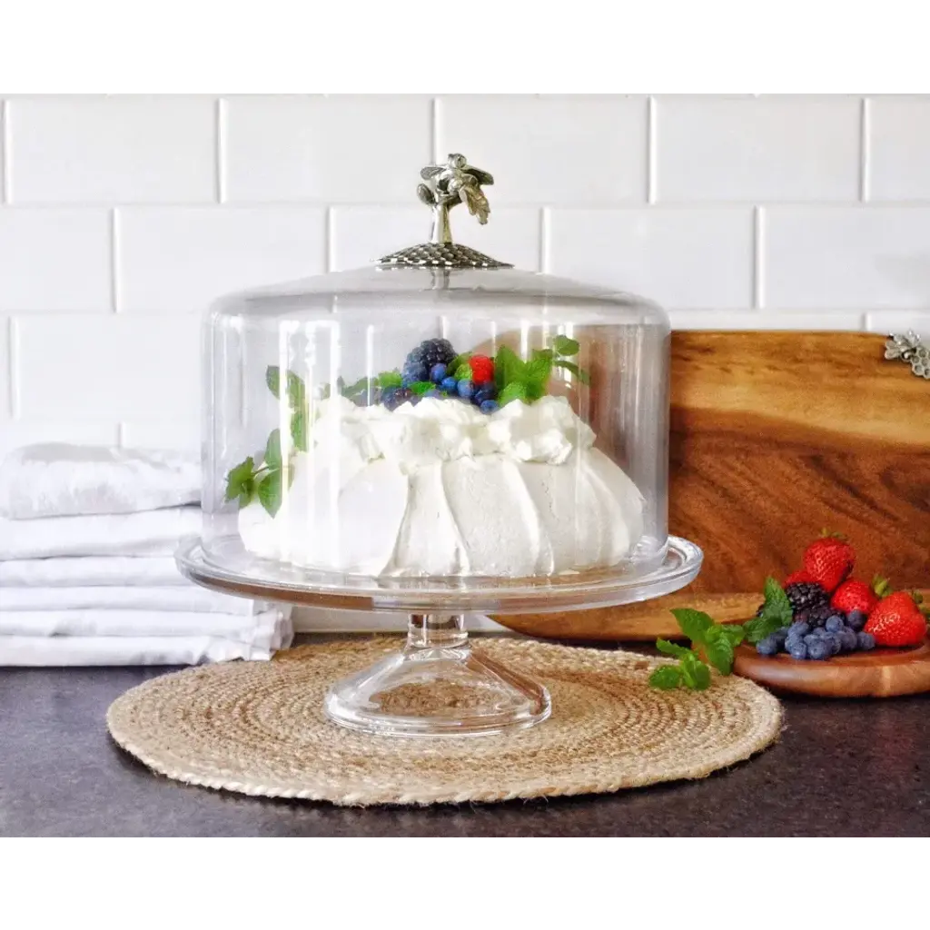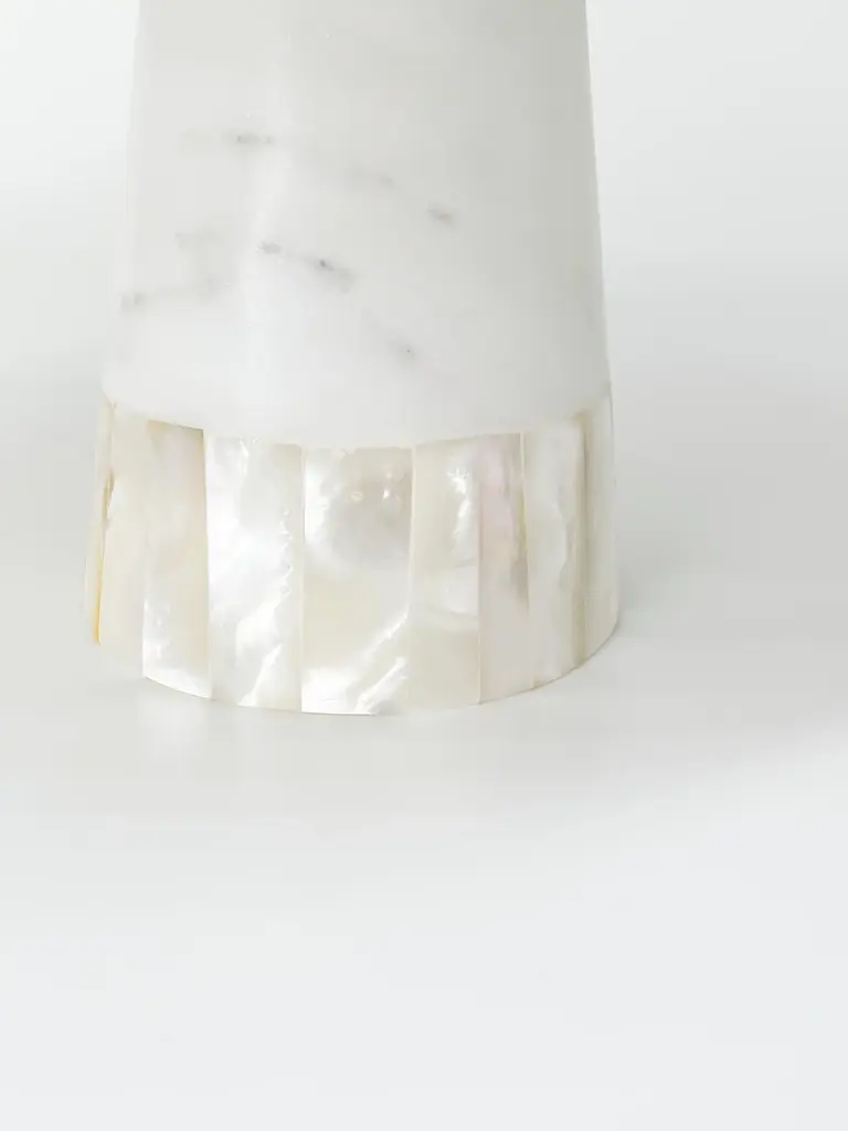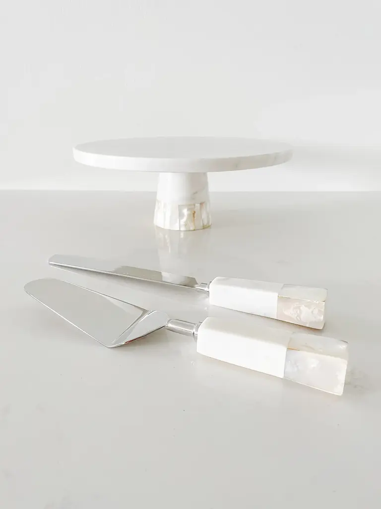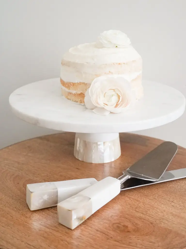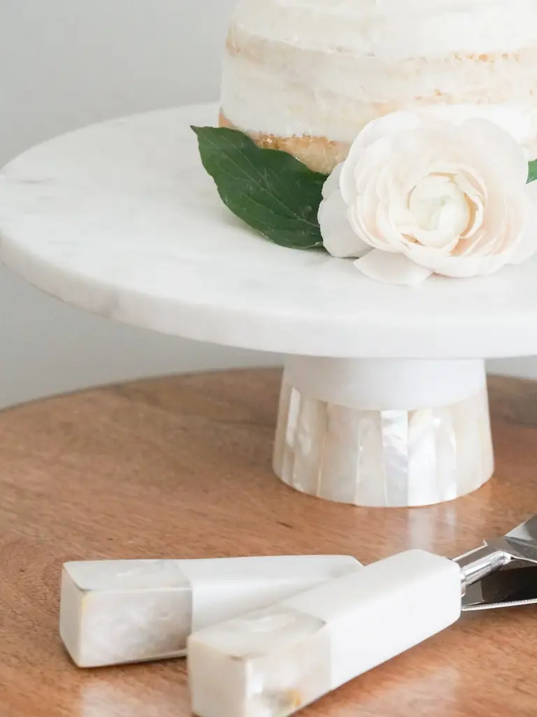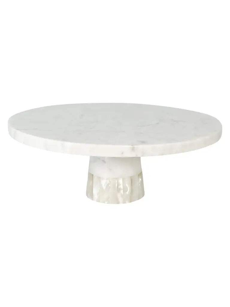 Our Mother of Pearl White Marble Cake Stand is designed to elegantly showcase cakes or pies with a diameter of up to 12 inches. It's a true indulgence for your entertaining needs. Each piece is lovingly handcrafted in the city of Agra, the very home of the Taj Mahal. These artisans have inherited and perfected their intricate hand-carving techniques through generations, ensuring that each creation is a masterpiece of timeless craftsmanship. Size: 12"D x 4.5" H Color: White Color Details: White Marble, Irridescent Mother of Pearl Shell The base unscrews for easy shipping. Made in India Hand wash only with mild soap, Towel Dry.