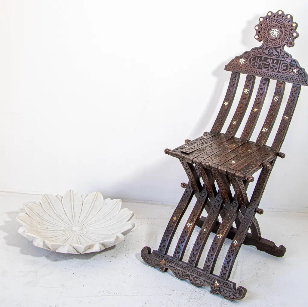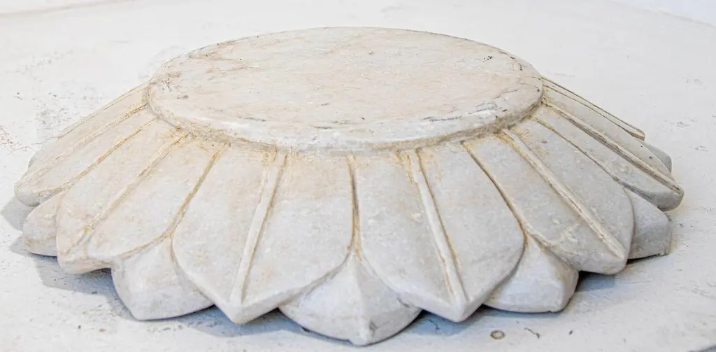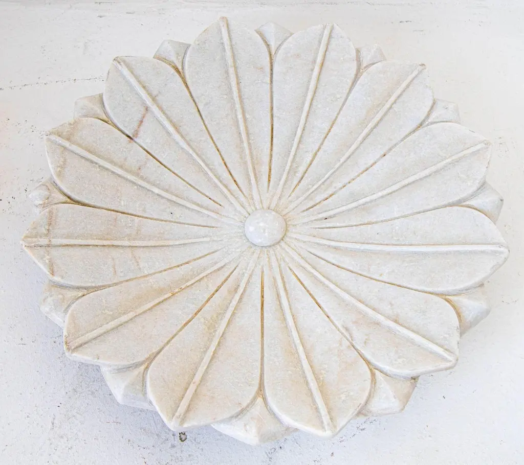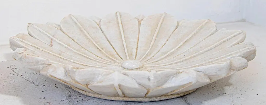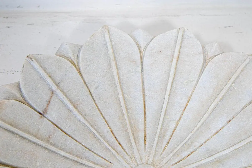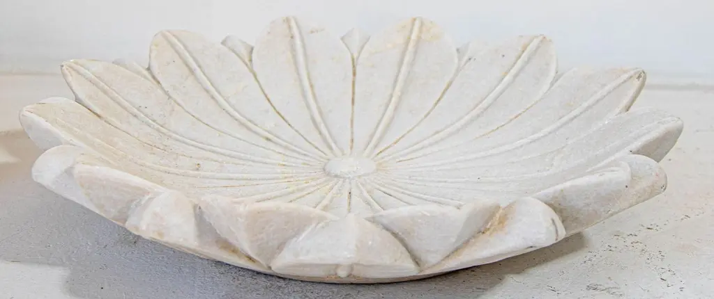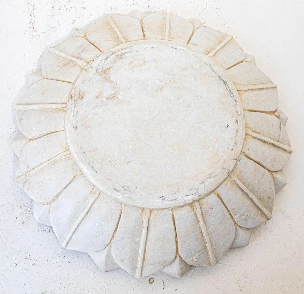 Vintage White Marble Open Lotus Flower Shape Large Blow Hand-Carved in India Raj MughalHandcrafted in India, you can use this lotus form bowl indoor or outdoor.Beautiful large white marble plate with carved open lotus flower motif and a polished finish. This Indian plate is the perfect centerpiece, fruit bowl or use with flowers or candles.A hand carved marble bowl from India, shaped as a Lotus flower, circa 1960. The natural inclusions in the stone confer this piece a singular iridescent shine. Ideal as an accent for any console, side table, coffee table or any other space where a touch of elegance is needed in its organic form.3 pieces available price is for one.This hand carved marble flower bowl is an artisanal piece made by hand and shows some irregularity. Dimensions:Height: 4.5 in. Diameter: 19.5 in. Style:Anglo-Indian Anglo Raj Mughal Islamic Materials and Techniques:Marble,Hand-Carved Place of Origin:India