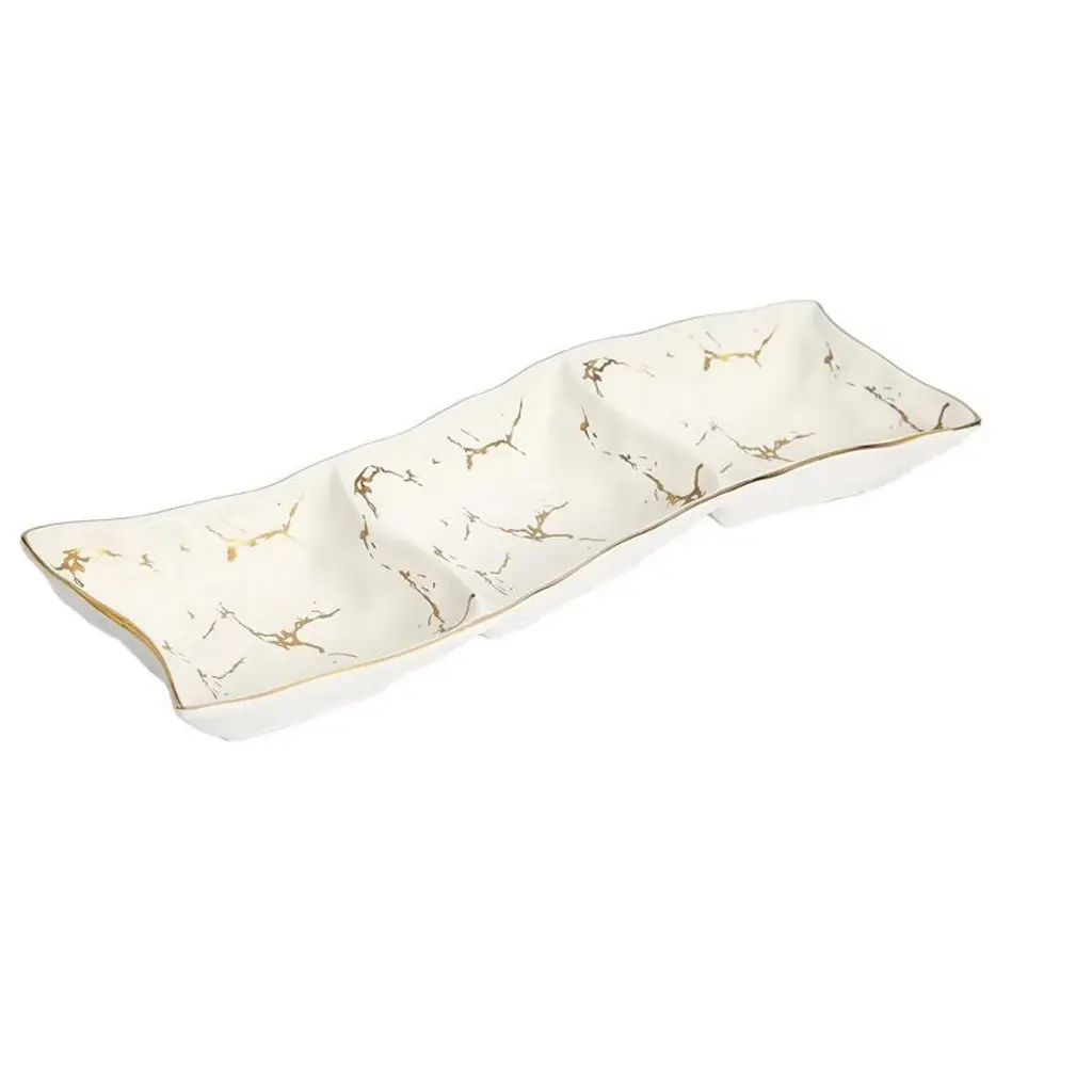 This multi- purpose dish can be used for condiments, dips, and candy. Crafted with a slightly wavy edge, the three compartments of this dish offer a unique sculpt. It is decorated with an allover gold marble design to add that extra lift to your dining setting. Practical while elegant this dish is ideal to use at festive or casual occasions