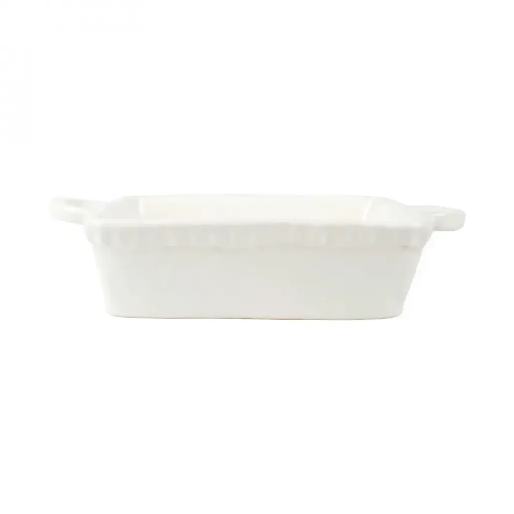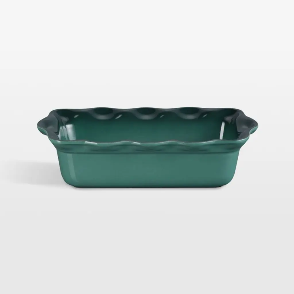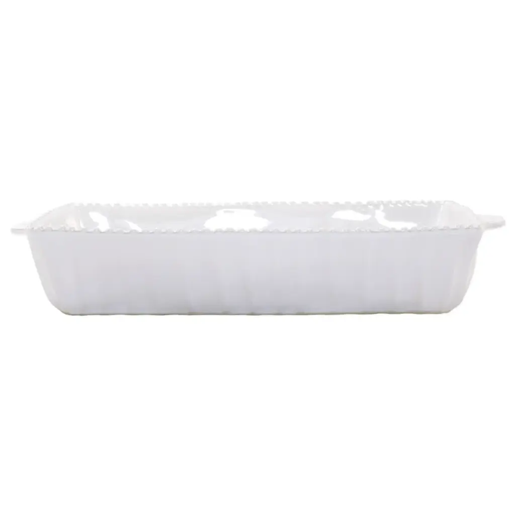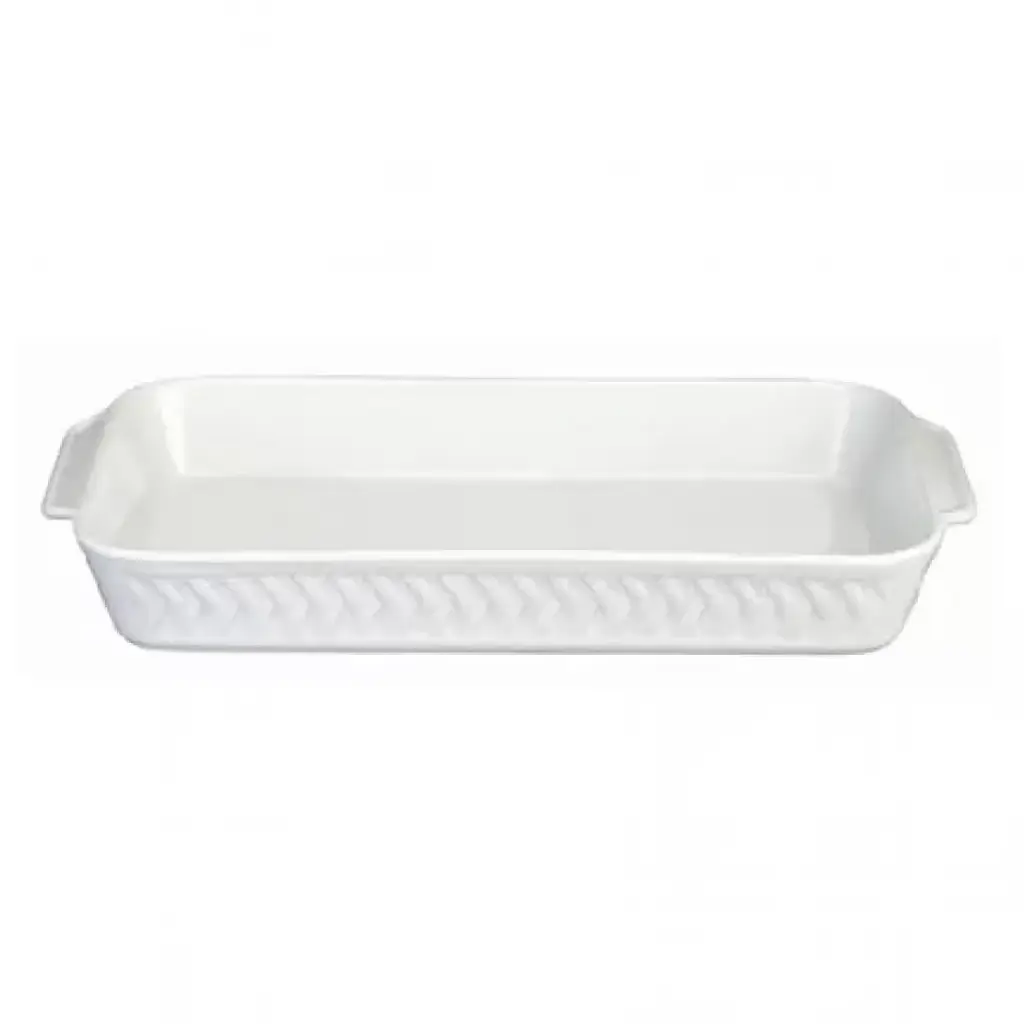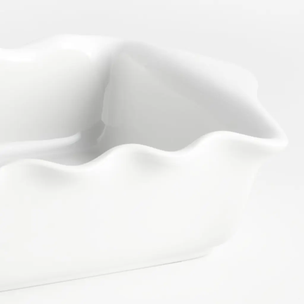 Sweets and savories go from oven to table in fresh white stoneware with flowing edges. Our ruffled rectangular baking dish bakes and presents pecan rolls, enchiladas and seven-layer bars with charming, classic style. Glazed by hand in bright white, our exclusive baker is microwave-, freezer-, oven- and dishwasher-safe for flexible preparation and easy cleanup.