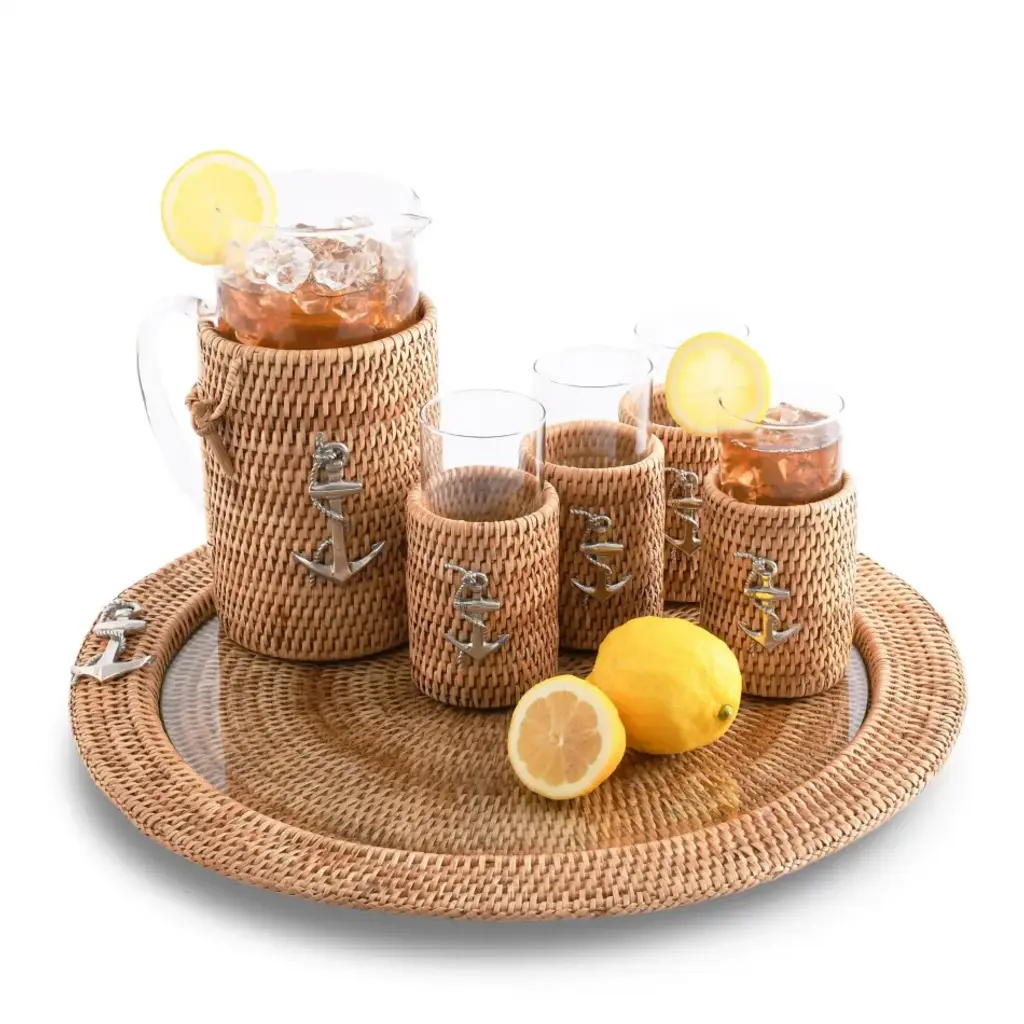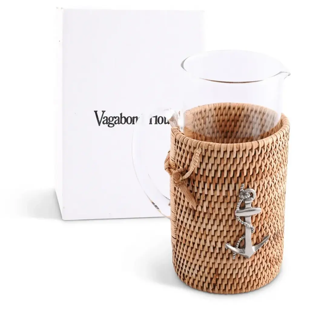 Savor the fusion of elegance and functionality with our Anchor Glass Pitcher from the Sea and Shore Collection. Boasting a size of 10.5 inches, this generously-sized masterpiece is intricately encased in hand-woven rattan and adorned with a stunning pewter anchor, symbolizing strength and depth of the oceans. The detachable glass pitcher serves an array of beverages, perfectly complementing your summer gatherings or ocean-themed parties. Vagabond House is a family-owned American company specializing in fine pewter tableware, servingware and giftware. Largely inspired by nature, their exclusive products are designed to be unique, functional heirlooms for those who seek to express tradition and style in both family and formal entertaining.