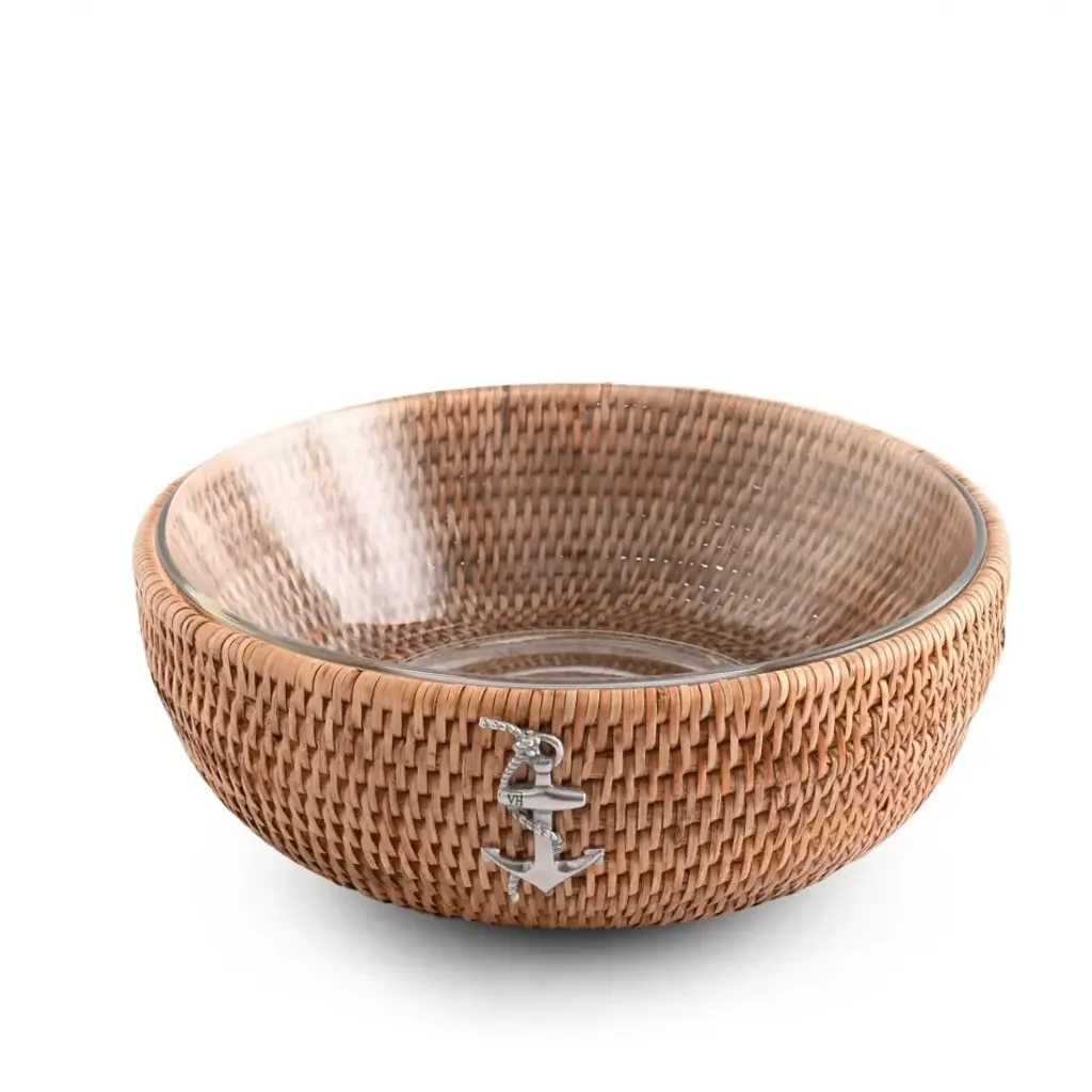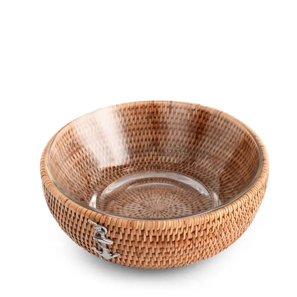 Introduce a coastal charm into your home with our exquisite Anchor Hand Woven Rattan Serving Bowl. It's a versatile piece that's excellently crafted for stylish maritime parties. Its generously sized 10.5" diameter is perfect for serving your favorite salads or fruits, and the removable glass bowl allows for an easy clean-up. The stunning pewter anchor adorning the side symbolizes stability and strength, enhancing your table with a deep oceanic connection. An ideal gift for Sea and Shore collectors! Vagabond House is a family-owned American company specializing in fine pewter tableware, servingware and giftware. Largely inspired by nature, their exclusive products are designed to be unique, functional heirlooms for those who seek to express tradition and style in both family and formal entertaining.