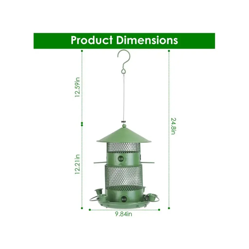 Product Type: Hanging Wild Bird FeederMaterial: IronColor: GreenItem Size: 63x25x25cm/24.8x9.84x9.84inItem Weight: 907g/1.99lbsPackage Size:21x21x22cm/8.27x8.27x8.66inPackage Weight:1190g/2.62 lbsPackage List:1x Bird Feeder6x Bird Standing Perches1x User Manual