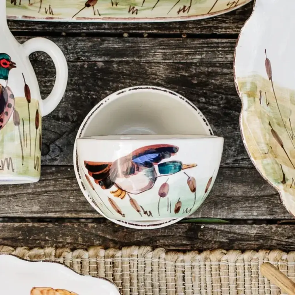 Handpainted in Tuscany and an instant classic for everyday dining, the Wildlife Mallard Cereal Bowl brings the grandeur and beauty of the outdoors to your table with exceptional detail and craftsmanship. Since 1983, Vietri has specialized exclusively in Italian handcrafted ceramics, stainless and pewter flatware, mouth blown glassware, lamps, urns and planters. Families of artisans with 3 or 4 generations of history create these special pieces using centuries-old techniques. The subtle color from a paintbrush and the curving stroke of the artist's hand are never repeated in quite the same way, making each piece truly unique.