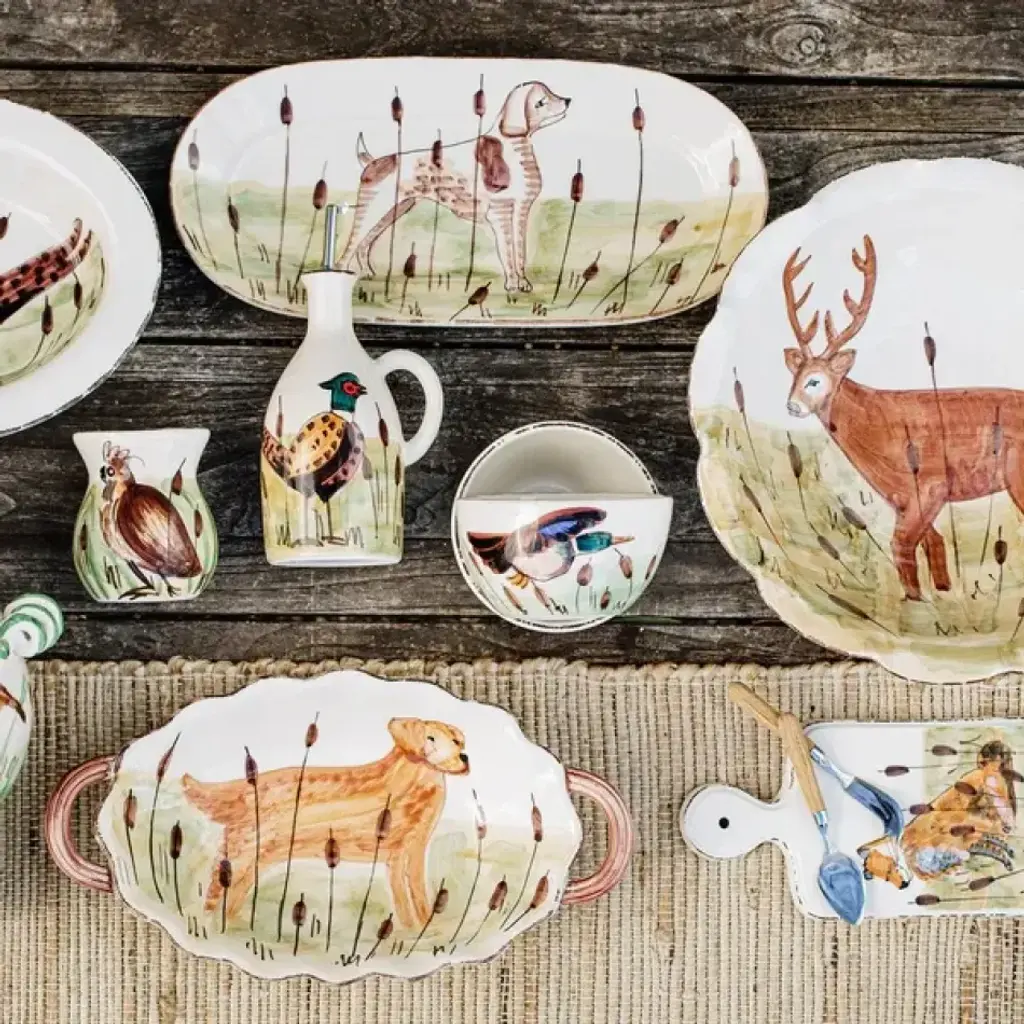 The Wildlife Spaniel Oval Platter brings the spirit of the great outdoors into your home with its intricate handpainted details. Featuring a spaniel on the hunt in vibrant color, this versatile platter is crafted by Italian artisans and is the perfect size for a variety of usesfrom serving meals to displaying fruits or appetizers. Its rustic charm and wildlife-inspired beauty make it a standout piece for any table. Since 1983, Vietri has specialized exclusively in Italian handcrafted ceramics, stainless and pewter flatware, mouth blown glassware, lamps, urns and planters. Families of artisans with 3 or 4 generations of history create these special pieces using centuries-old techniques. The subtle color from a paintbrush and the curving stroke of the artist's hand are never repeated in quite the same way, making each piece truly unique.