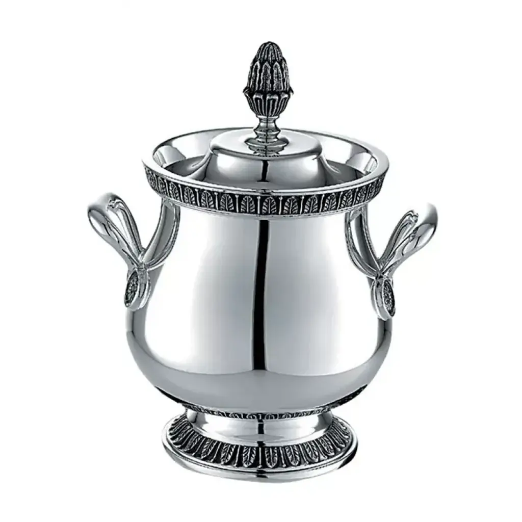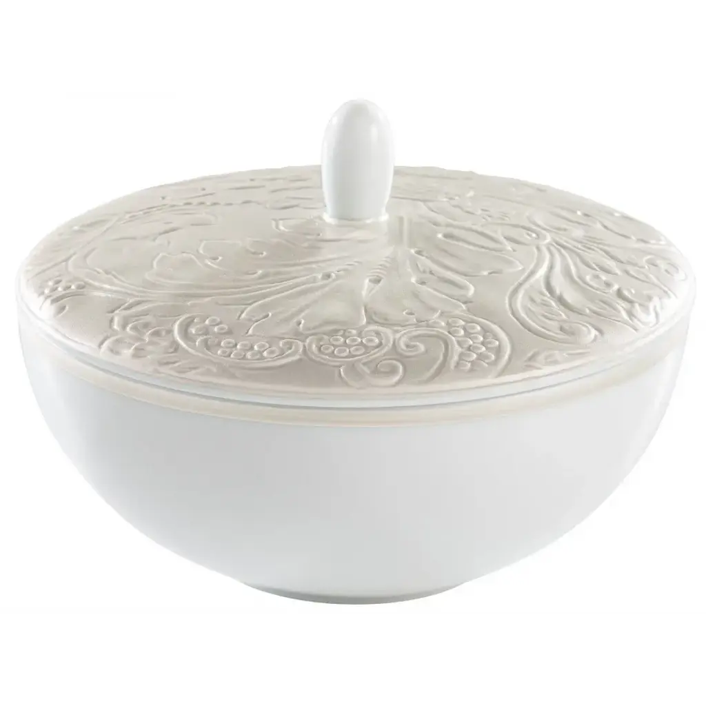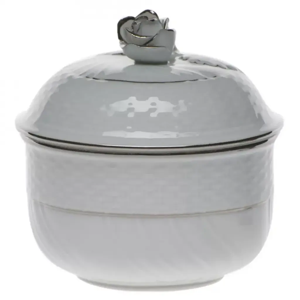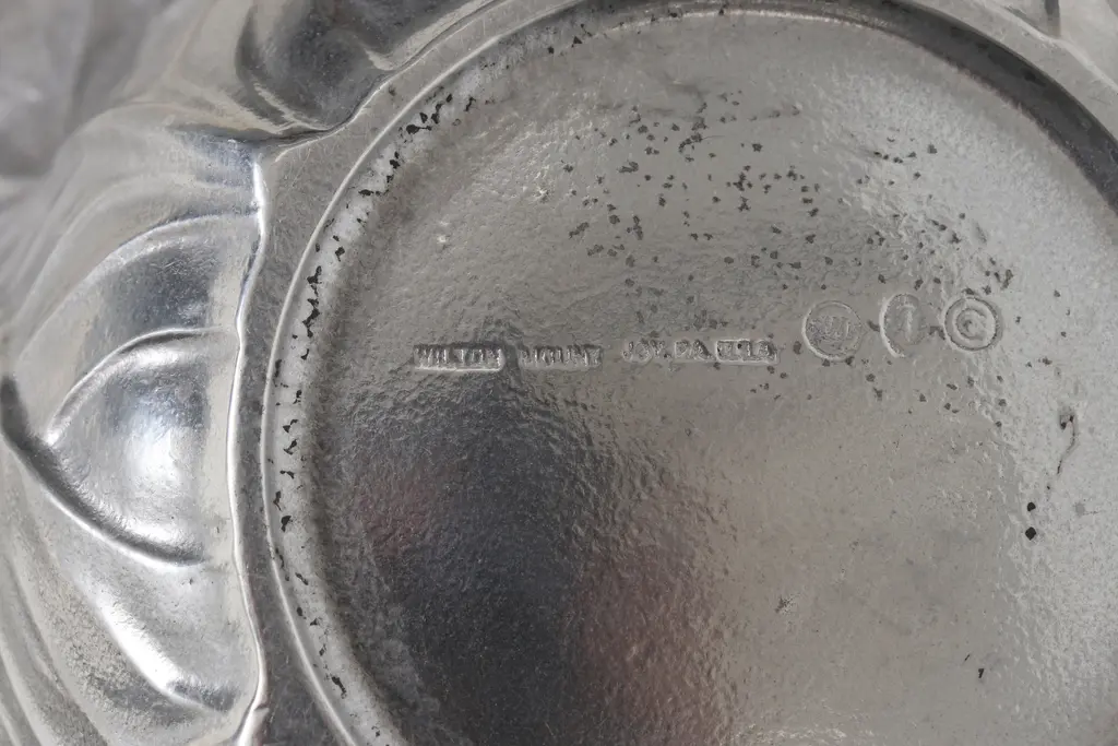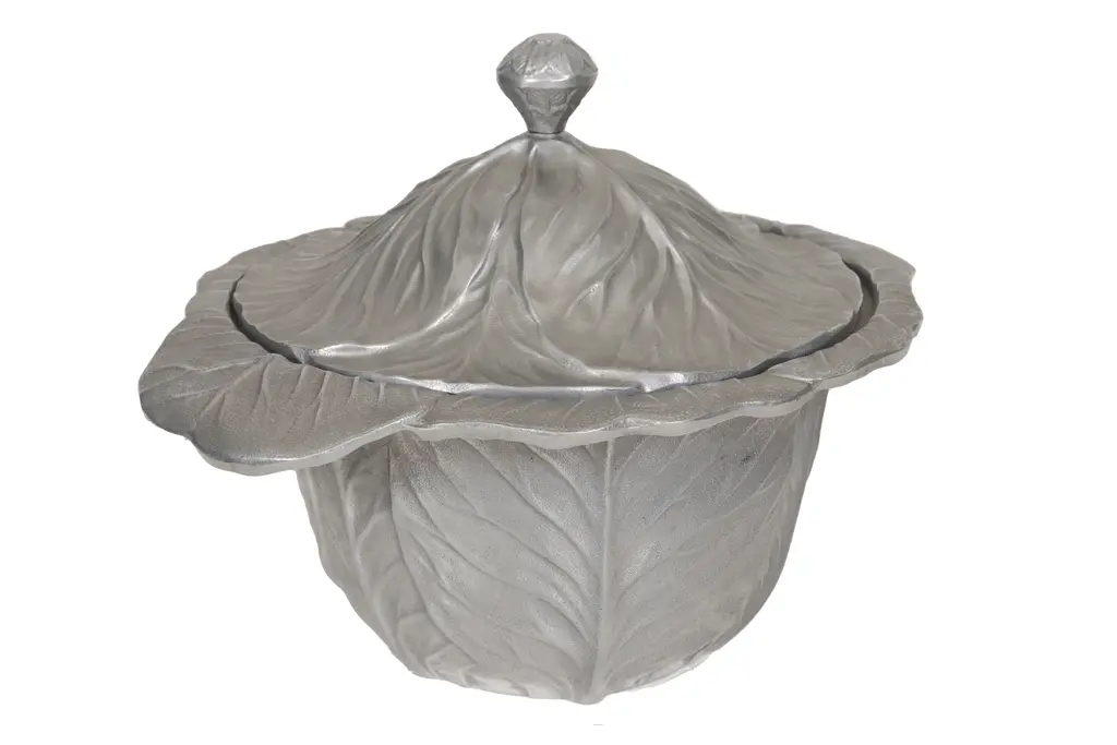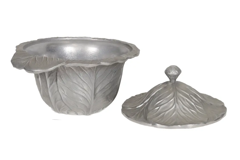 A cast armetale dish with lid, shaped like a cabbage, made by Wilton. Cast with fine leaf details in a matte pewter color, marked underneath "Wilton Mount Joy, PA." along with the RWP and copyright mark.
