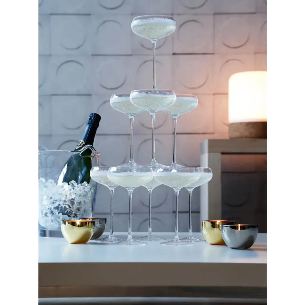 Mouth-blown champagne saucers with wide bowls and tall stems.