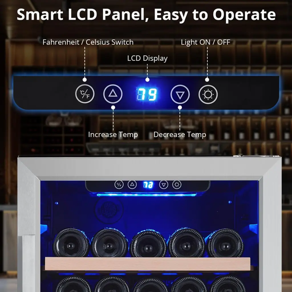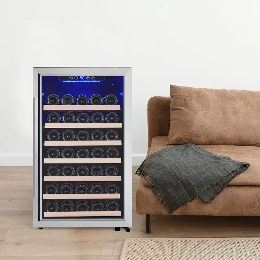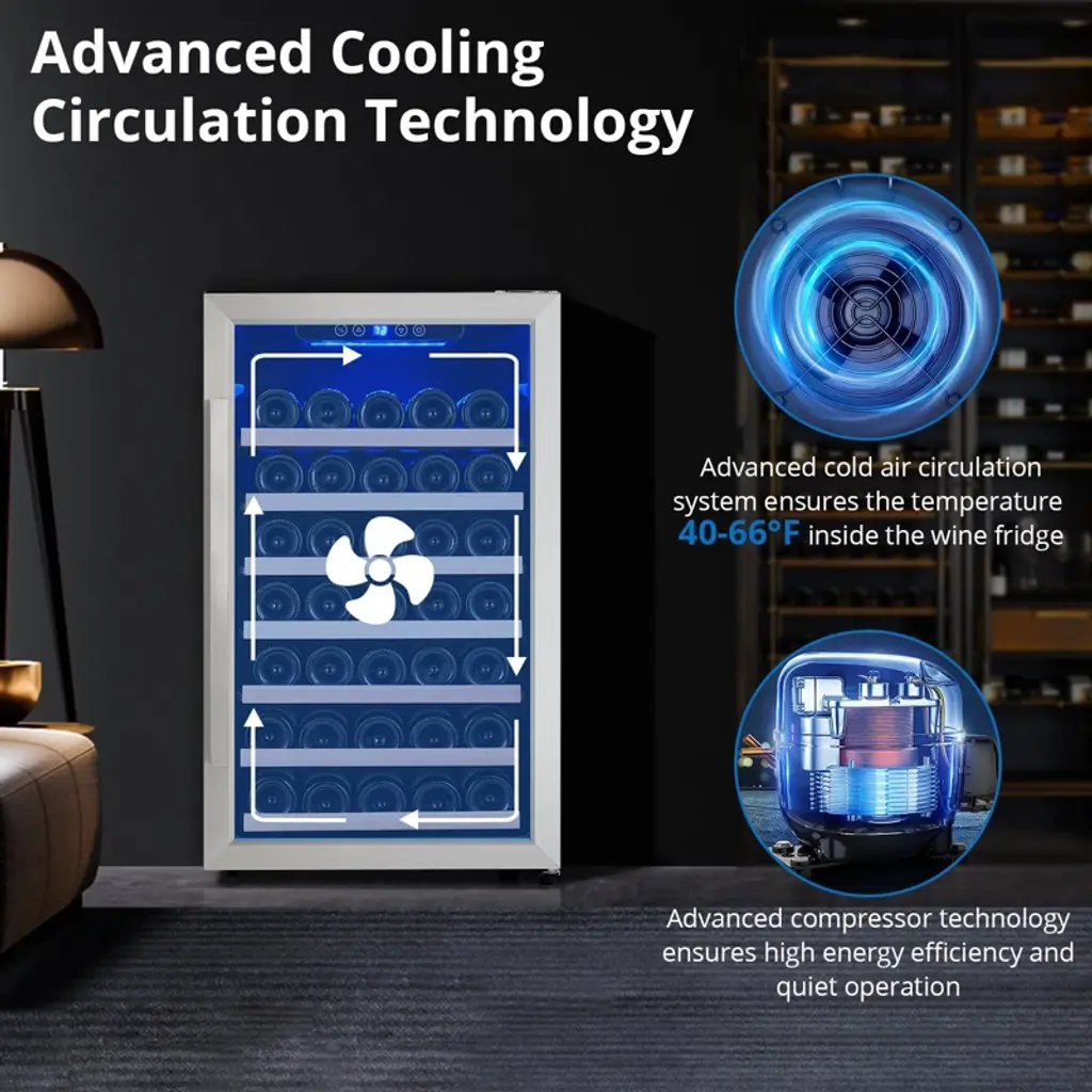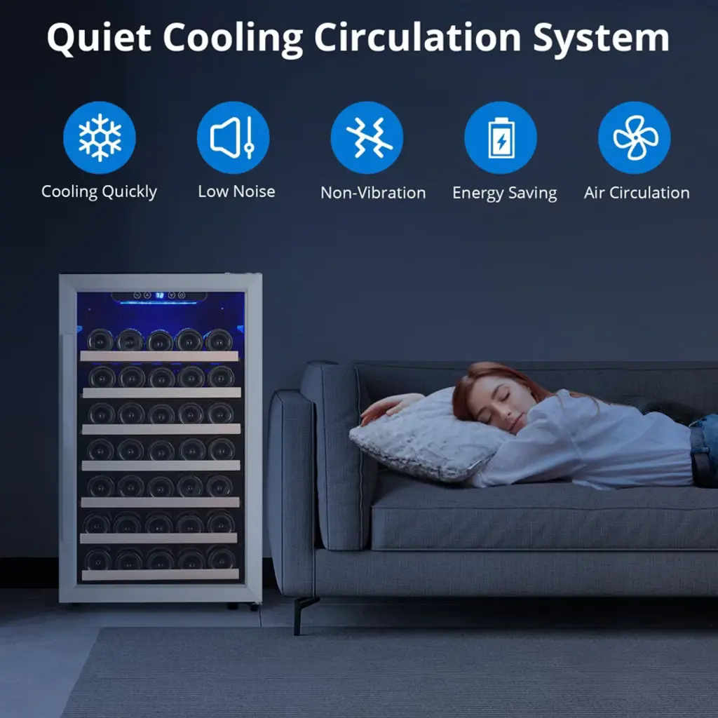 Keep your wines at their best with this 52-Bottle Wine Fridge Cabinet. Featuring separate cooling zones (40-66°F) for red and white wines, this fridge ensures your beverages are always at the ideal temperature. The quiet compressor system and minimal vibration create a peaceful environment, perfect for homes and offices. The digital touch screen offers easy temperature adjustments and memory settings, while the sleek glass door and adjustable shelves accommodate various bottle sizes. Compact and freestanding, this wine cooler is perfect for kitchens, bars, or home offices.