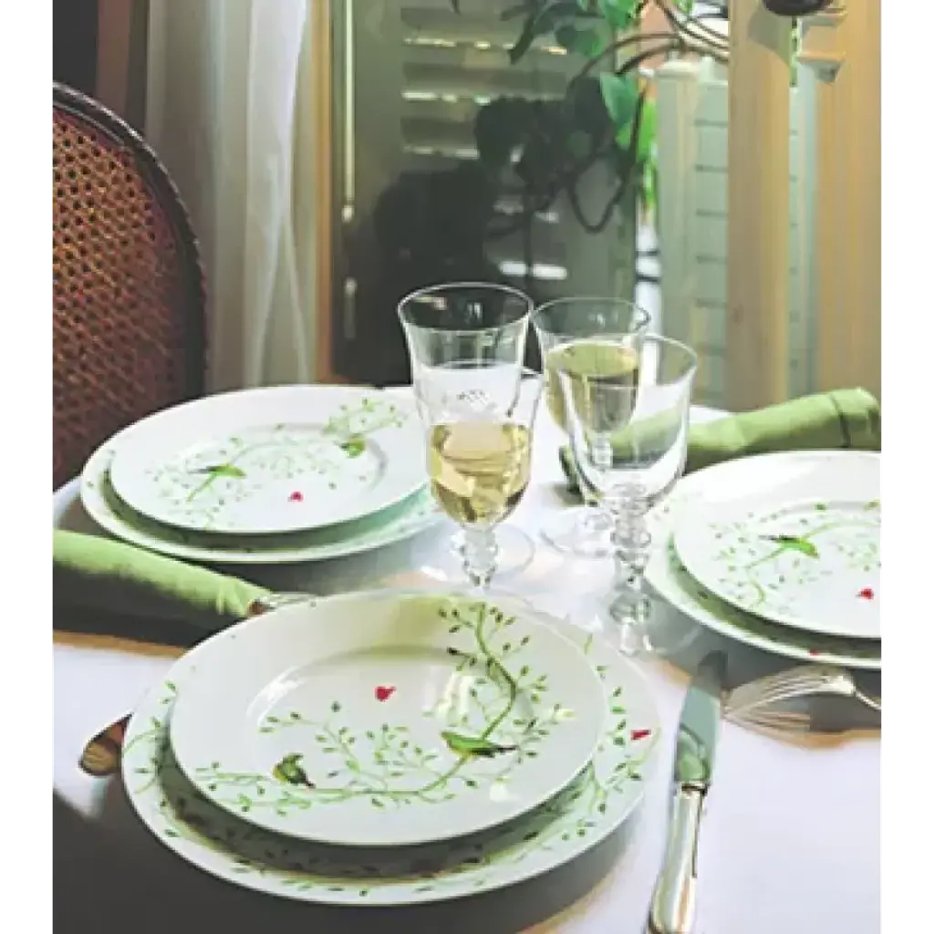 Birds and butterflies adorn Raynaud's Wing Song dinnerware, also known as Histoire Naturel. Designed by Pamela Baldwin, a portion of the proceeds goes to the Jane Goodall Institute to help preserve endangered species. Five-piece place setting includes dinner plate, salad plate, bread/butter plate, teacup, and saucer. Raynaud was established in 1849 and is the only survivor of 11 porcelain factories existing in Limoges, France. After years of research, Raynaud discovered techniques to create infinite combinations of fade-resistant decorations that is still used by porcelain makers. Boasting a client list of numerous presidents to Princess Diana, Raynaud has been the synonym of quality, known and recognized on every continent.