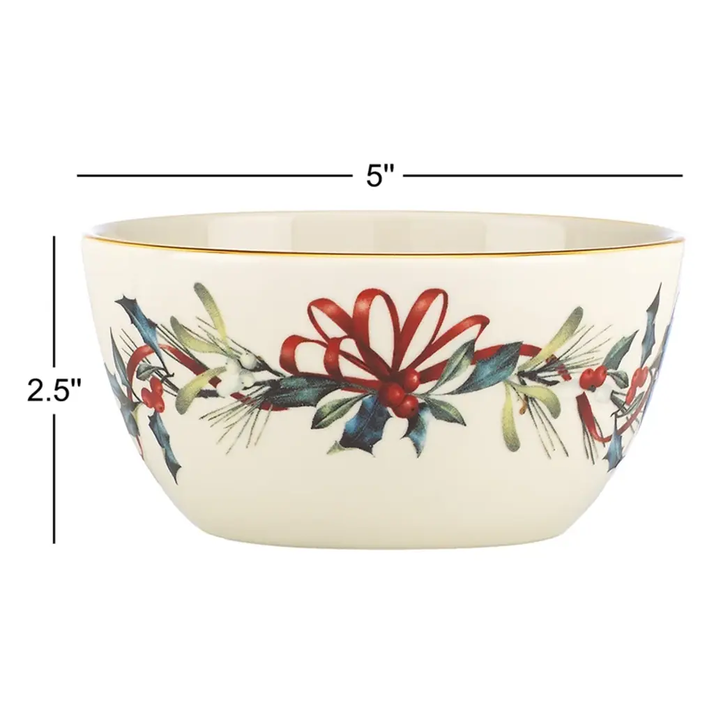 A joyful wreath of holly and ivy sprigs decorates the porcelain of this winter greetings bowl. We added a 24-karat gold trim along the top so it catches the flicker of candlelight at Christmastime.