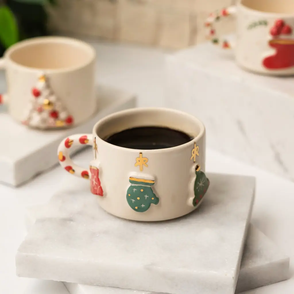Embrace the spirit of the season with the Winter Wonderland Mug, featuring an adorable array of holiday icons in a cozy, hand-painted design. This festive ceramic mug showcases a trio of 3D winter essentials—a red stocking, a blue mitten, and a green hat—each embellished with delicate snowflake patterns and golden accents. The cheerful, polka-dotted handle adds a playful touch, making this mug a delightful way to enjoy your favorite winter drinks. Ideal for bringing a bit of seasonal cheer to your mornings or for gifting to loved ones who adore festive decor.
