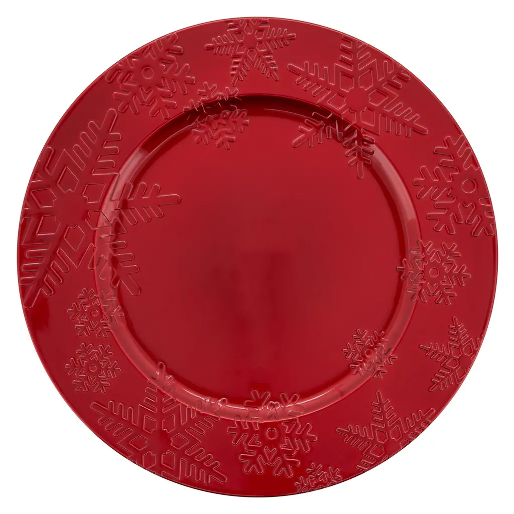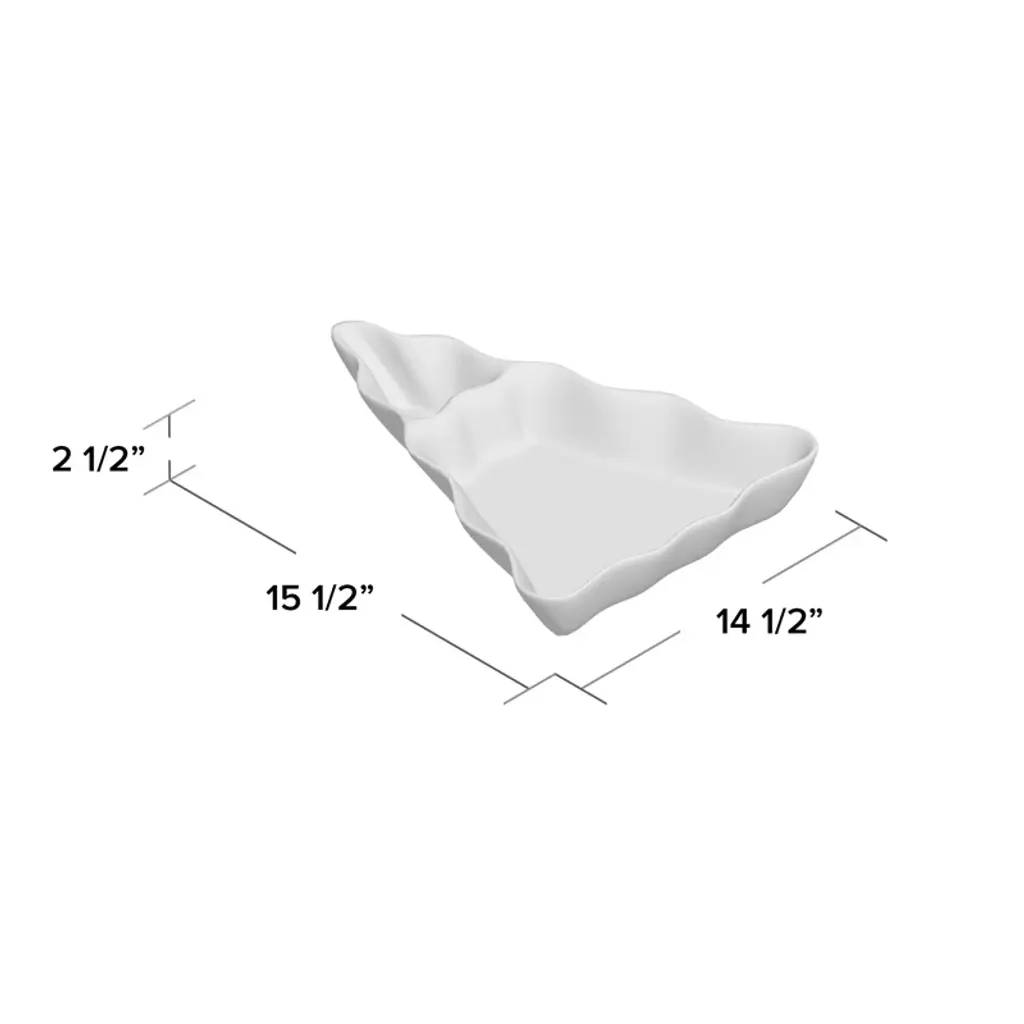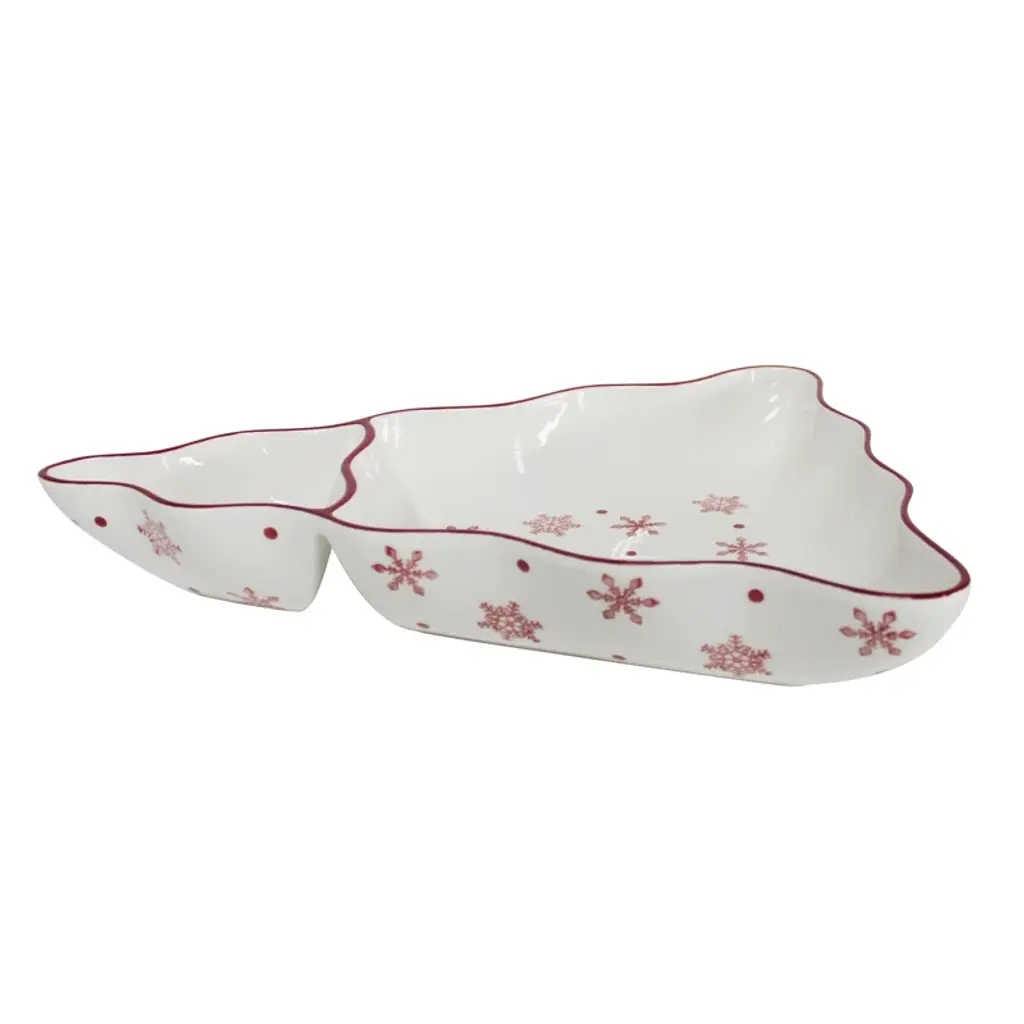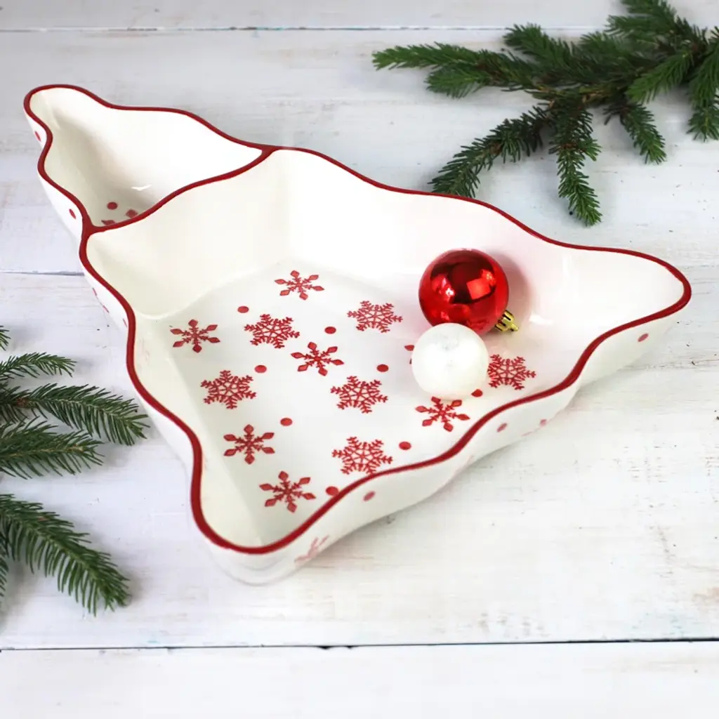 Give your chips and dips a festive look with this serving platter! Showcasing a design inspired by Christmas trees, it's crafted from earthenwarewith a scalloped edge, and red and white snowflake motif for extra seasonal style. And if your queso or other warm dips start to cool off, this piece is microwave safe, so you can easily heat them back up. This platter is dishwasher-safe, so cleaning up after a holiday snack is as easy as a quick cycle.