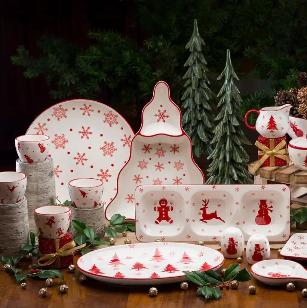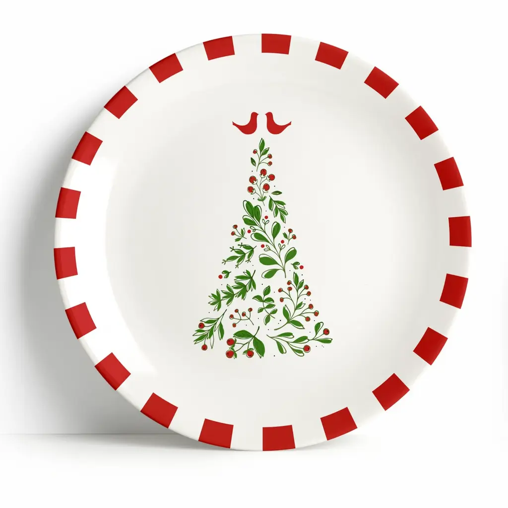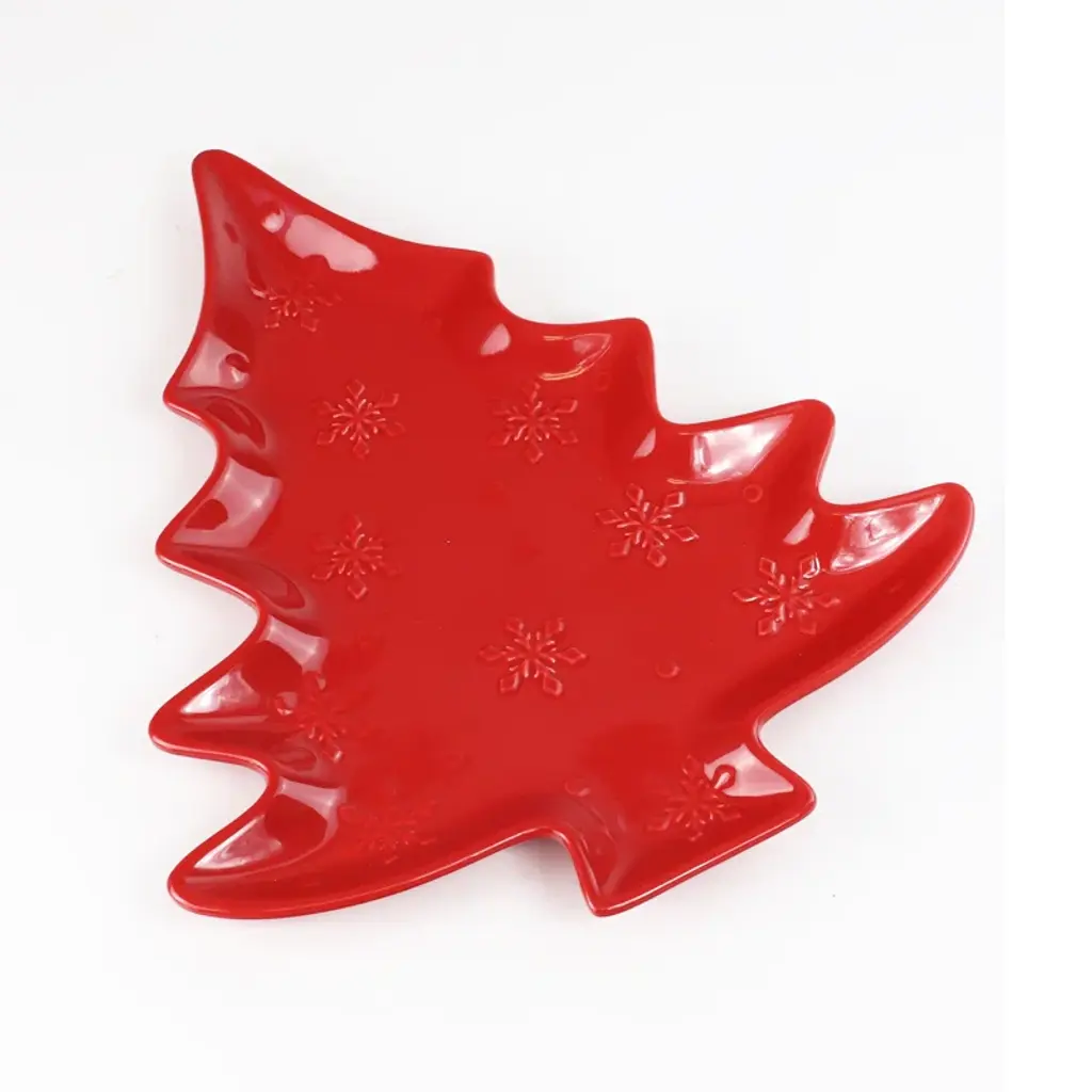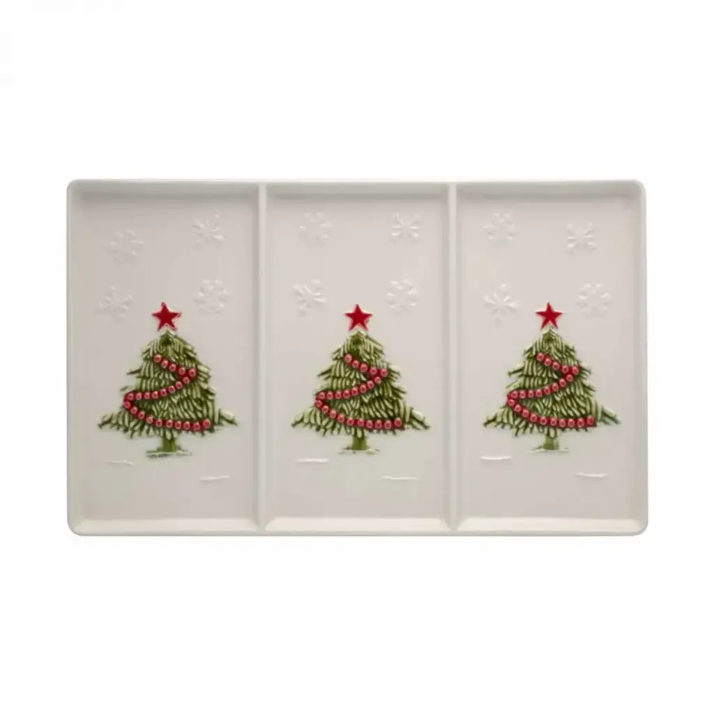 Give your chips and dips a festive look with this serving platter! Showcasing a design inspired by Christmas trees, it's crafted from earthenwarewith a scalloped edge, and red and white snowflake motif for extra seasonal style. And if your queso or other warm dips start to cool off, this piece is microwave safe, so you can easily heat them back up. This platter is dishwasher-safe, so cleaning up after a holiday snack is as easy as a quick cycle.