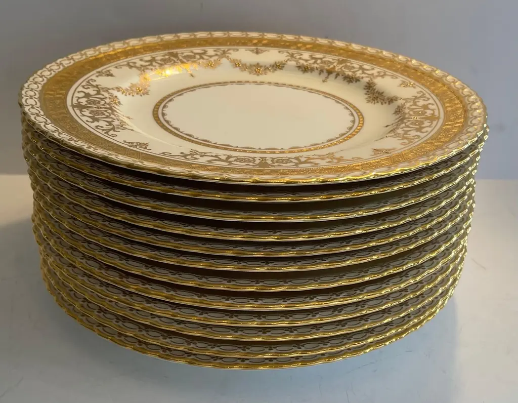 Wonderful Service 12 Minton Ovington's Raised Gold Hand Painted Dinner Plates