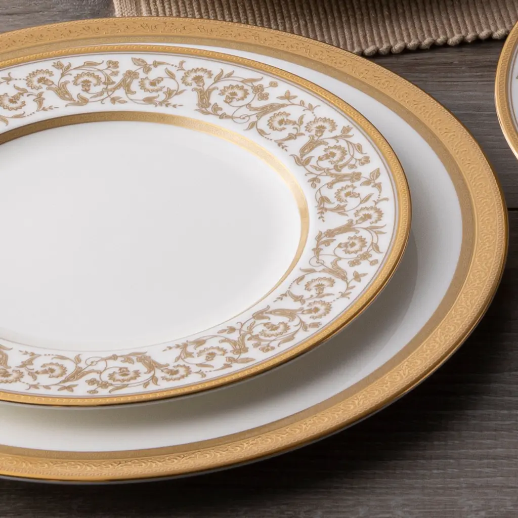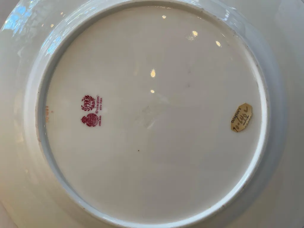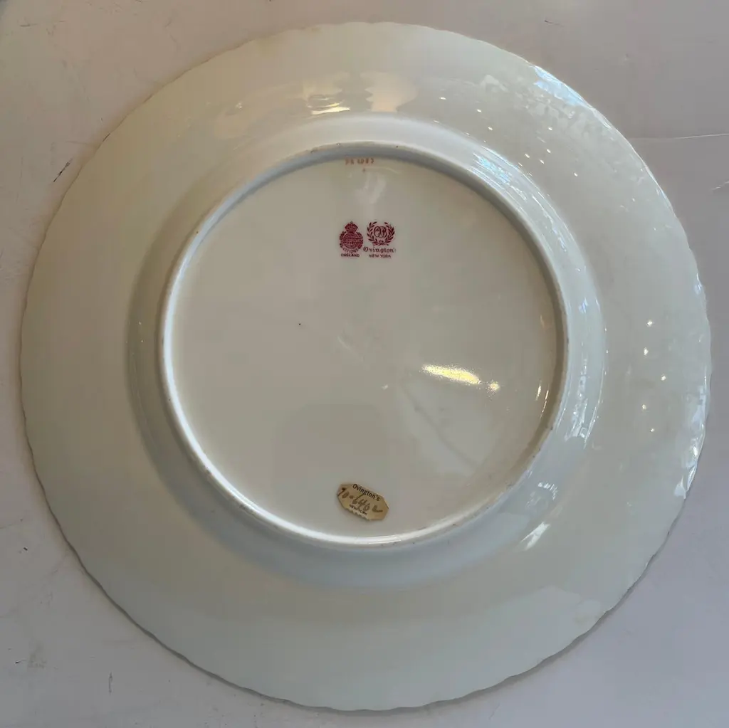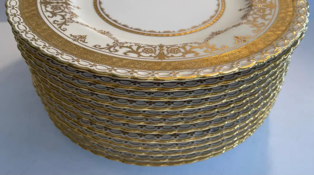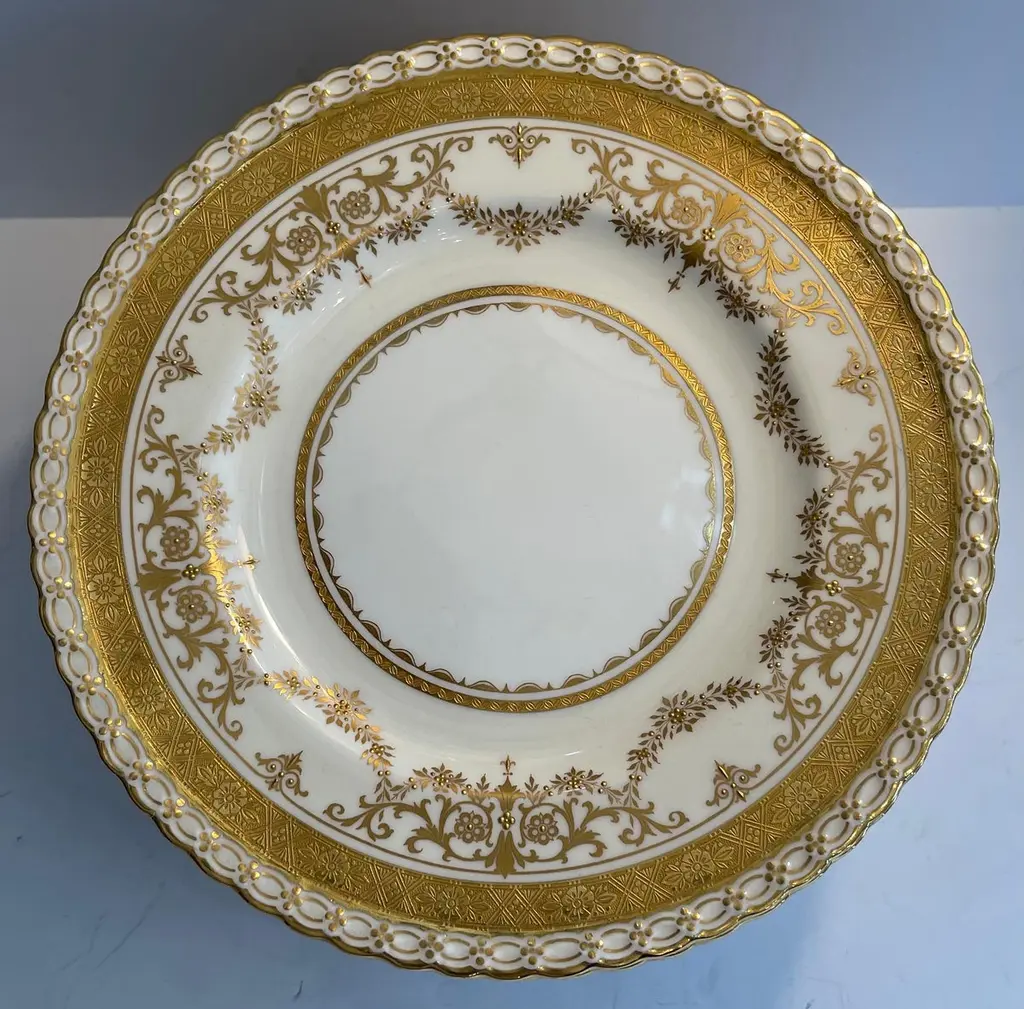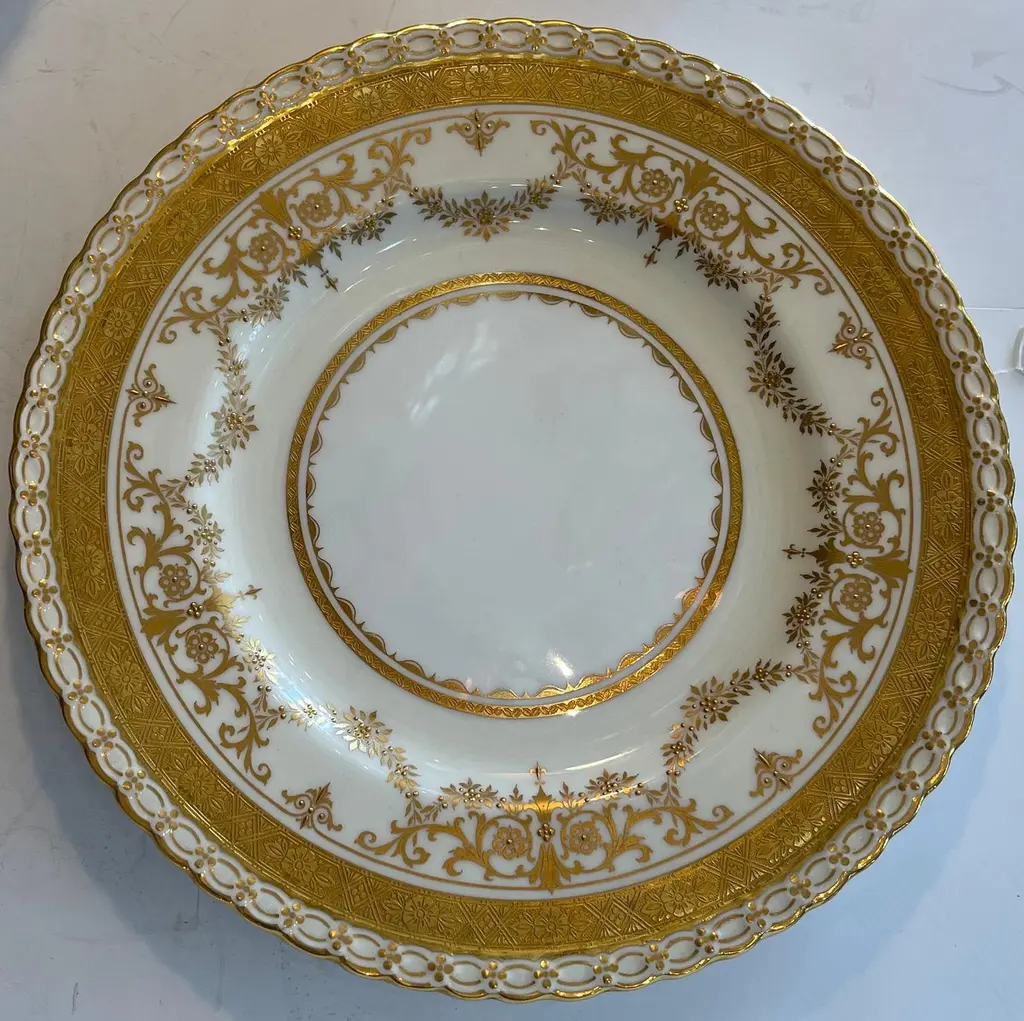 A Wonderful Service Of 12 Minton Raised Gold Hand Painted Dinner Plates Retailed By Ovington's New York, Seem To Have Never Been Used Some Retaining Original Sticker.