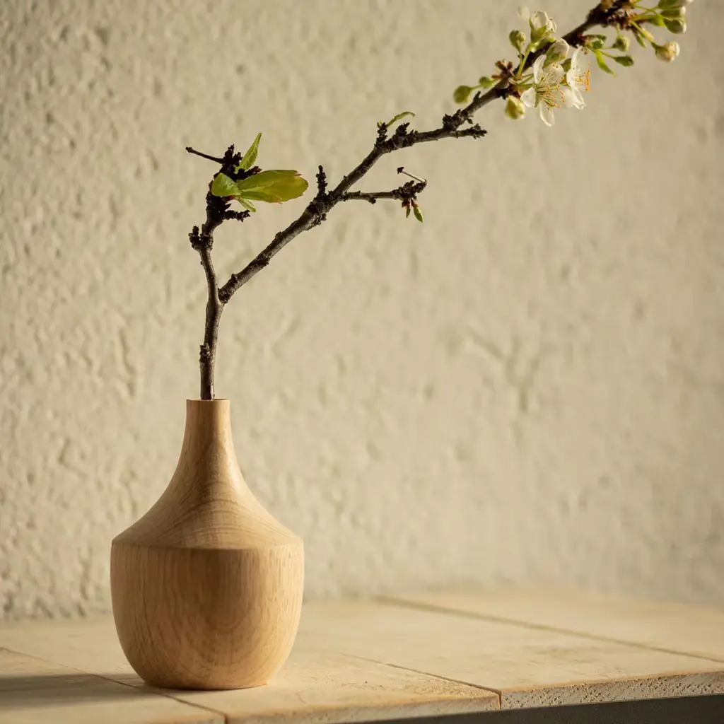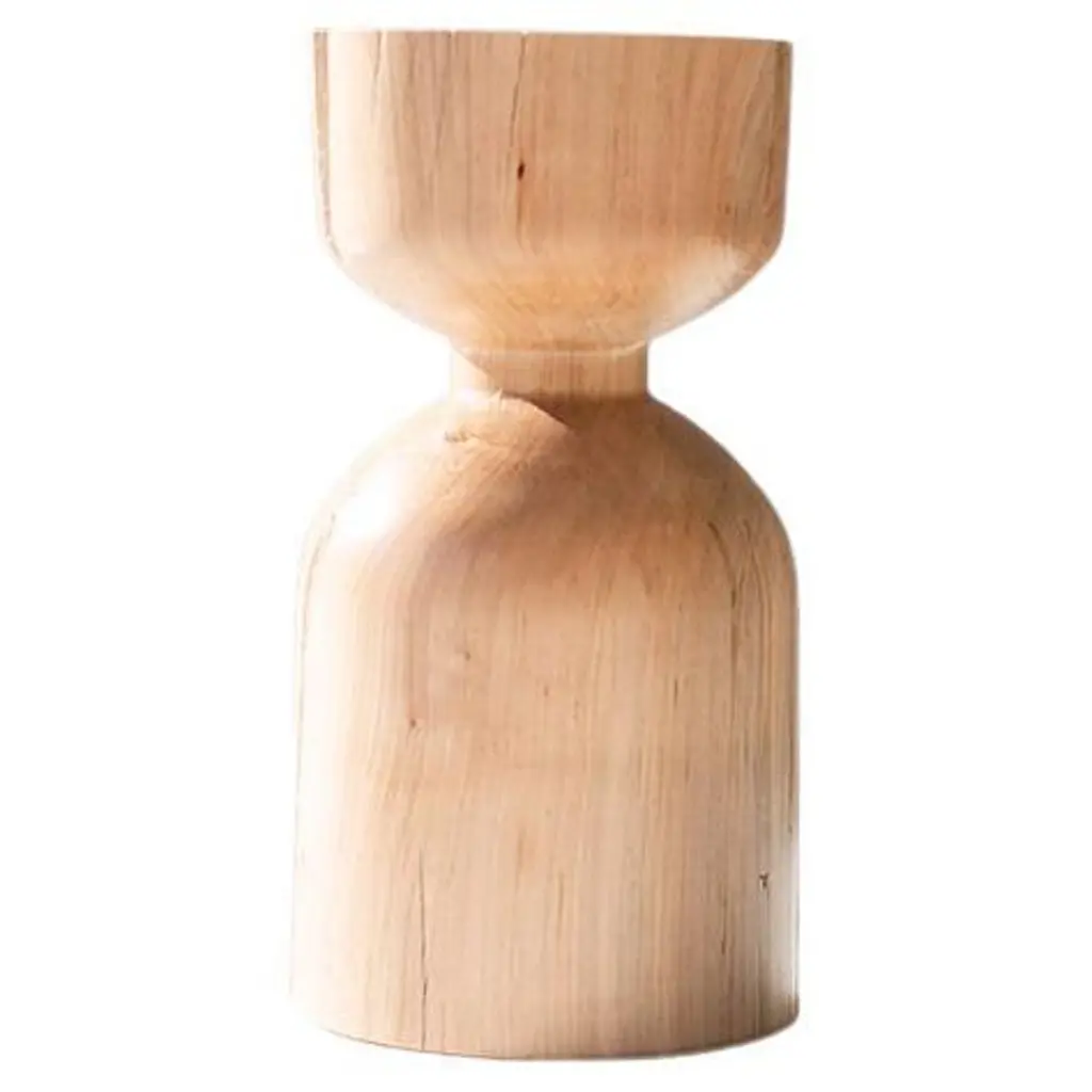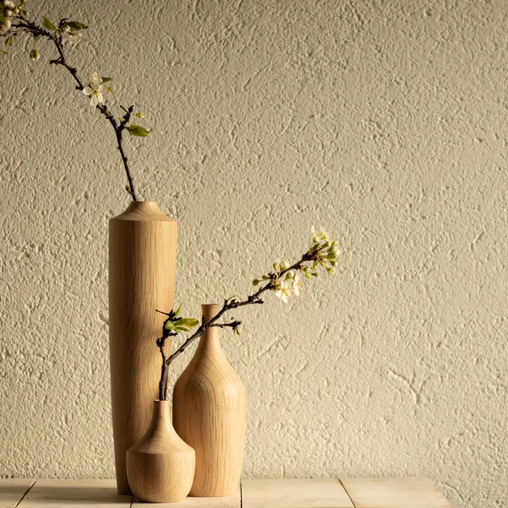 Designed to host dried flowers or simply serve as a decorative statement, this set of vases will add a charming touch to rustic and minimalist interiors, alike. Fashioned of chestnut wood, this set features two distinctive silhouettes, one tall and slender and the other short with a long neck. Upon request, the wood can be treated with specific oils to prevent soiling, in which case the color will tend to darken. Do not soak in water or wash in a dishwasher, clean only using a damp cloth.