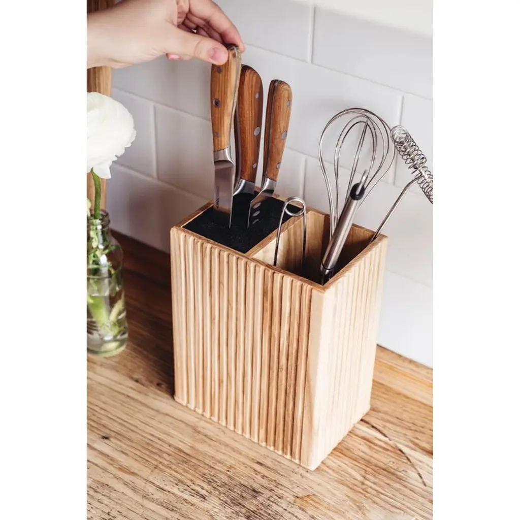 Heirol's Woody knife holder helps keep the knives at hand in the kitchen! The other side of the two-piece block has bristles so that the knives stay sharp even when stored. The other side, which has no bristles, is well suited for storing ladles and other kitchen utensils. The plastic bristles are easy to remove and wash.