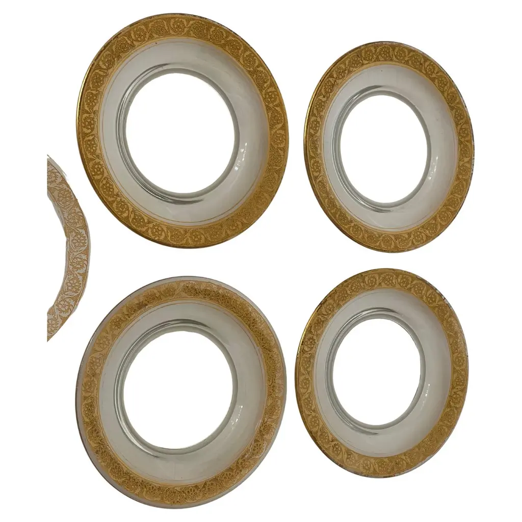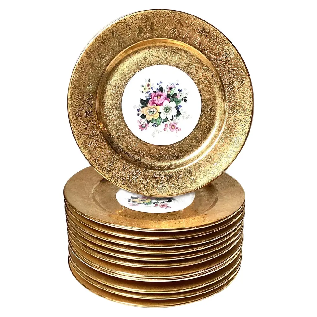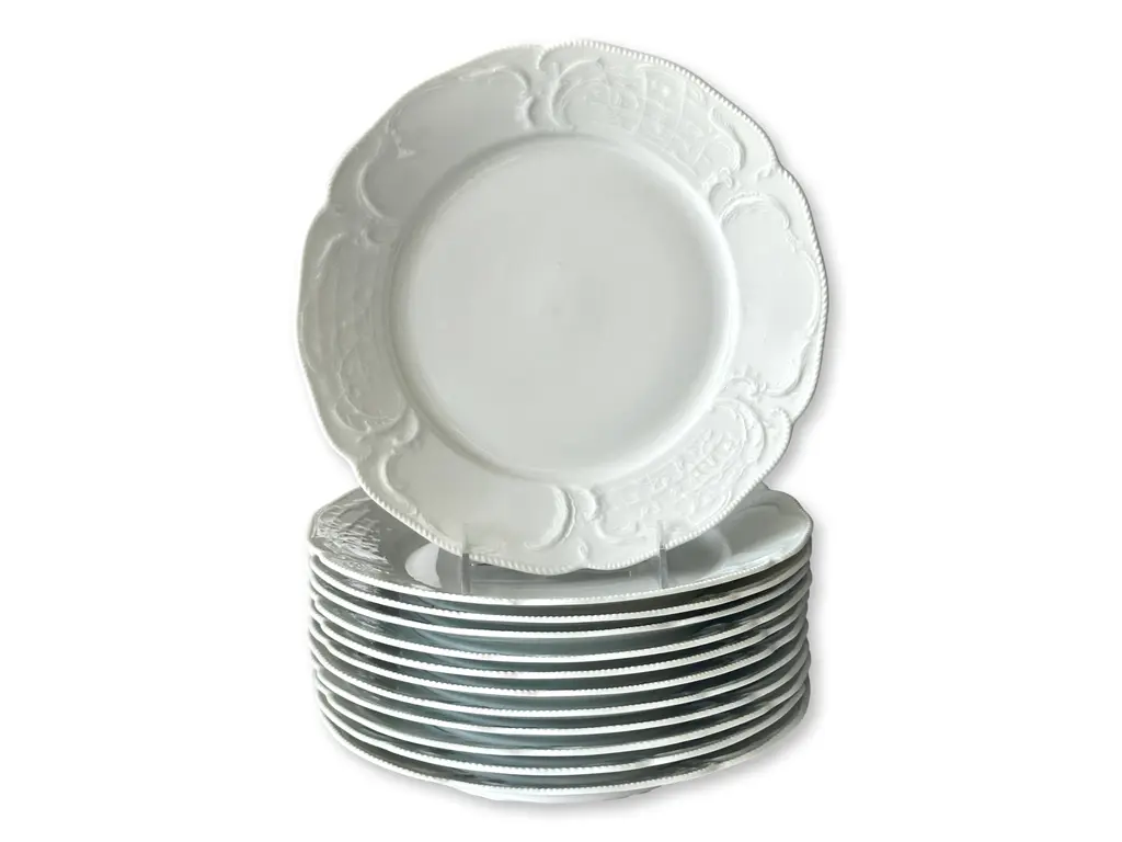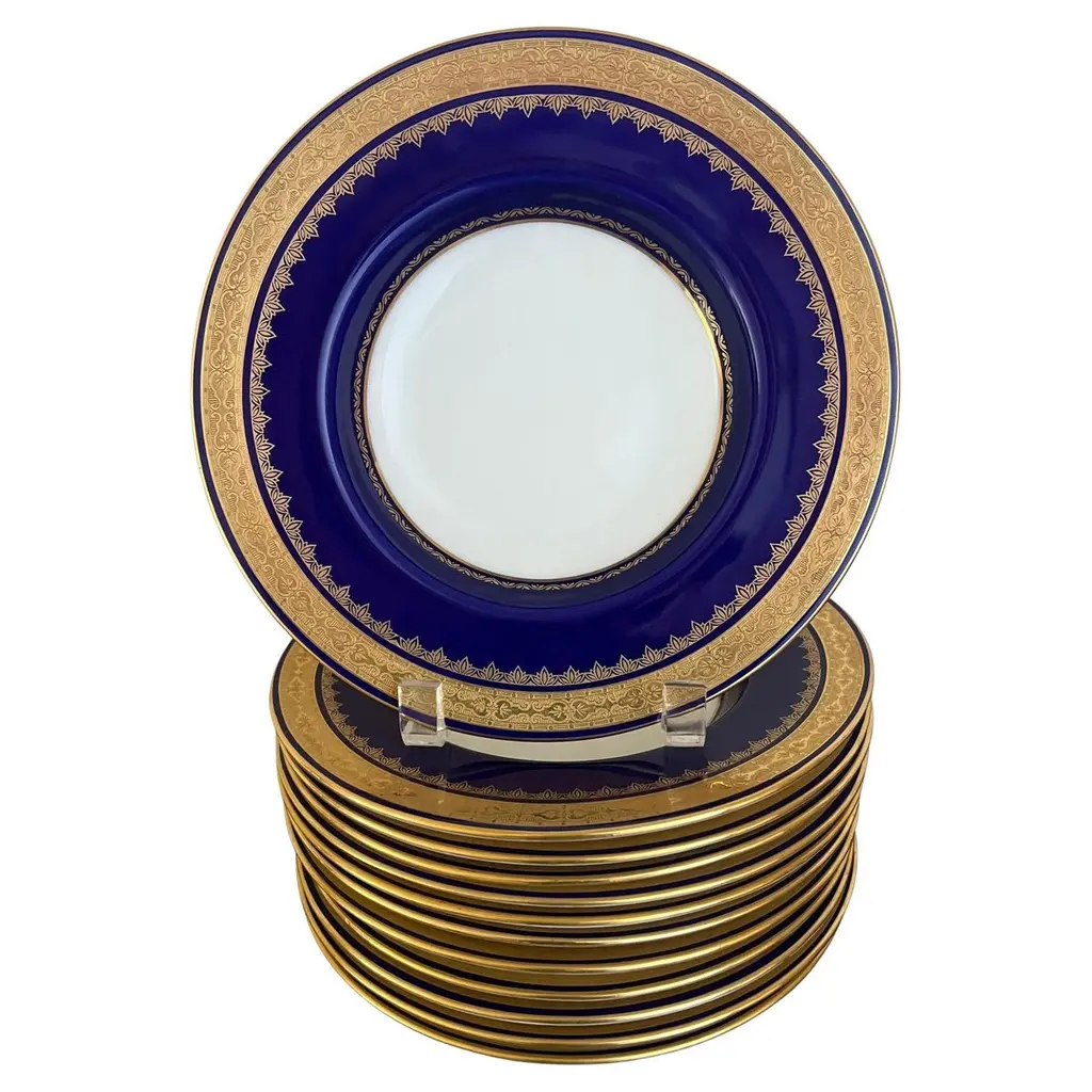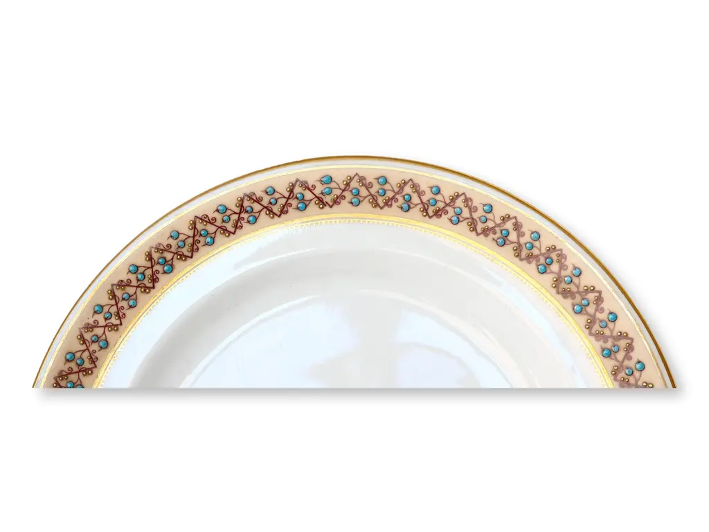 This exquisite set of 12 antique English Worcester porcelain dinner plates features beautifully detailed raised hand-enameled borders accented with intricate turquoise dots. The fine craftsmanship and elegant design showcase the timeless artistry of Worcester porcelain, making these plates perfect for refined dining or display. A stunning addition to any collection or table setting. Impressed early Worcester marks on undersides.