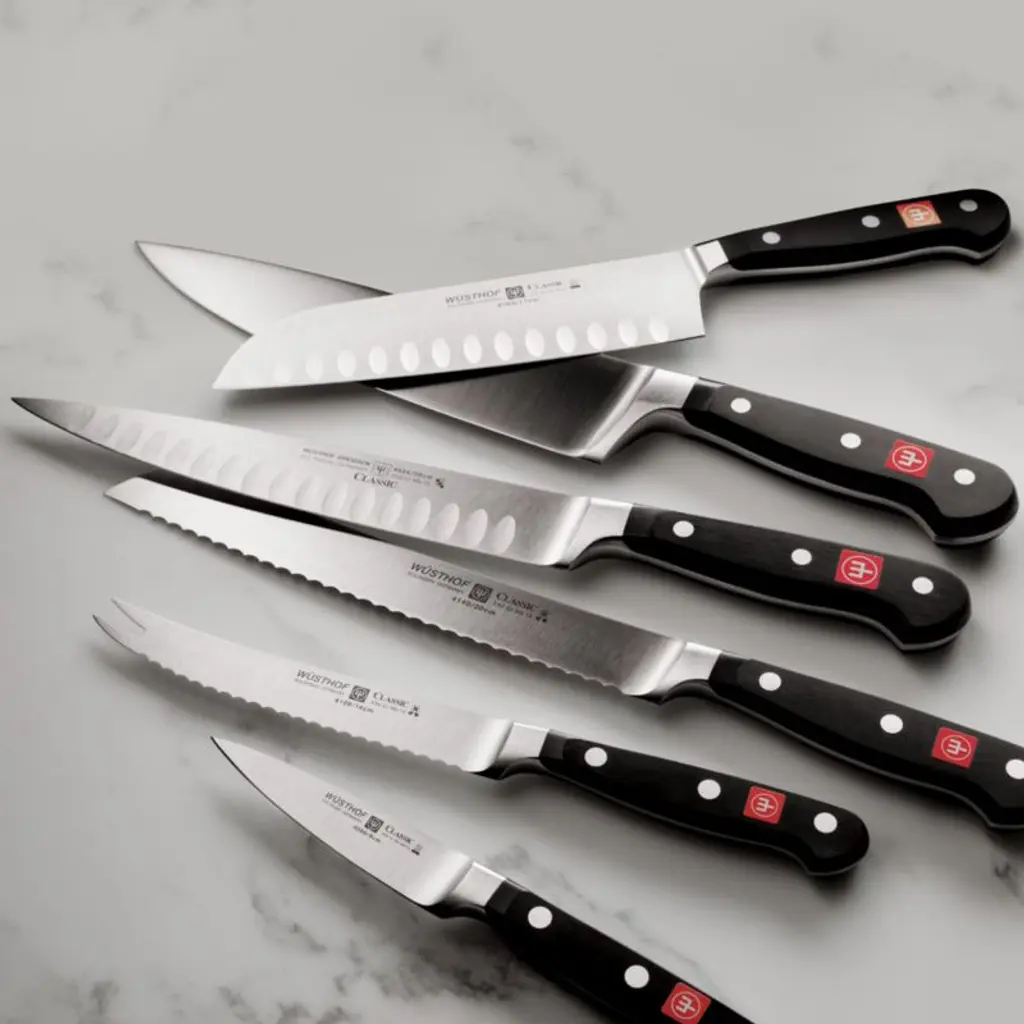 Add to your cutlery collection with this extra-wide chef's knife. Forged blade is tempered and hardened steel with a long-lasting, V-ground edge. Full tang adds weight and balance. High-carbon, no-stain blade is easy to sharpen.Produced by skilled craftspeople in the knife-producing capital of the world, Wüsthof cutlery has been crafted in Solingen, Germany, for over 200 years. Need help choosing? Here's your essential guide to choosing the best knifeView all Wusthof products Wüsthof and other Wedding Registry offers