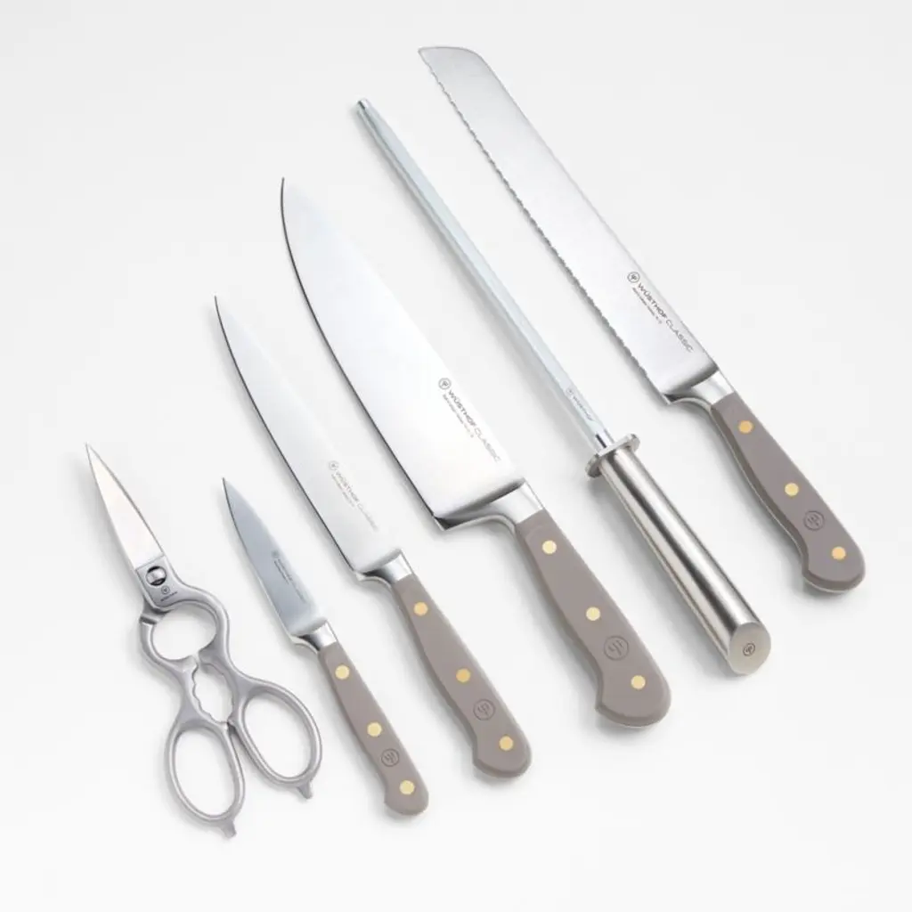The perfect partner to expressive cuisine, our exclusive set of grey-handled knives complements your kitchen with beautiful color. Part of Wusthof's Classic series known for its durability and high quality, each knife in this set is forged from a single piece of high-carbon stainless steel and finished with a long-lasting edge. Brass-riveted handles provide the full-tang knives with a comfortable handhold as well as a dash of neutral color inspired by oysters. An excellent housewarming, graduation or wedding gift, this seven-piece set includes a 3.5-inch paring knife, 6-inch utility knife, 8-inch chef knife, 9-inch double serrated bread knife, 8.5-inch stainless steel kitchen shears and 9-inch brushed stainless steel honing steel in a whitewashed wooden knife block.Produced by skilled craftspeople in the knife-producing capital of the world, Wüsthof blades have been crafted in Solingen, Germany, for over 200 years.