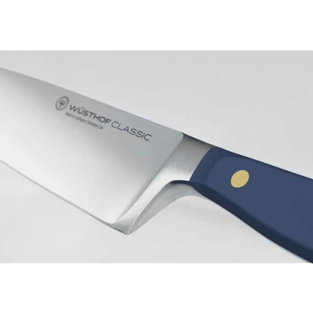 The perfect partner to expressive cuisine, this chef's knife jazzes up your kitchen with its bold blue handle. Part of Wusthof's Classic series known for its durability and high quality, the chef's knife is an essential component of any cutlery collection. The knife excels at a wide variety of cutting tasks thanks to a sharp blade that's precision forged from a single piece of high-carbon stainless steel and finished with a long-lasting edge. The brass-riveted handle provides the full-tang knife with a comfortable handhold as well as a dash of deep color inspired by wild blueberries.Produced by skilled craftspeople in the knife-producing capital of the world, Wüsthof blades have been crafted in Solingen, Germany, for over 200 years.