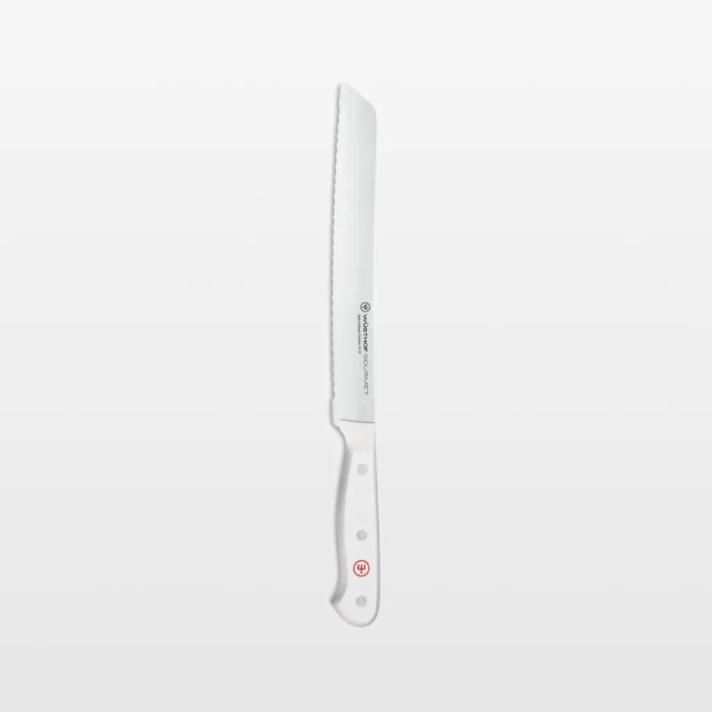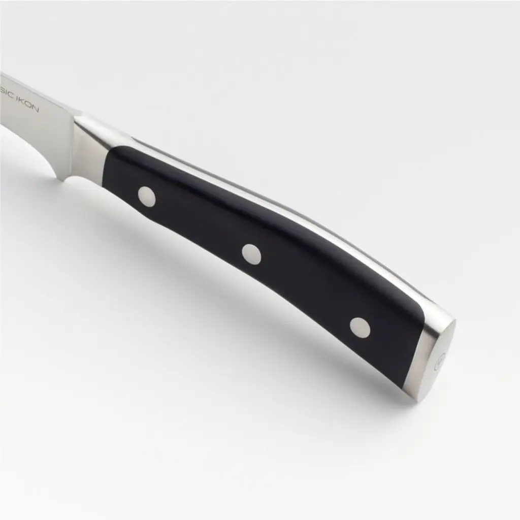 The Ikon series builds on the Wusthof fine cutlery tradition with thinner blades, refined easy-grip ergonomic handles, and recessed double bolsters that allow full sharpening to the heel. Serrated super slicer is a versatile, all-purpose workhorse with a tempered and hardened high-carbon steel blade. Perfectly curved and balanced, the triple-riveted molded handle with full tang is stronger and more sanitary than wood. This knife is strategically contoured to de-bone and trim meats, poultry and fish with ease.Produced by skilled craftspeople in the knife-producing capital of the world, Wüsthof cutlery has been crafted in Solingen, Germany, for over 200 years. Need help choosing? Here's your essential guide to choosing the best knifeView all Wusthof products Wüsthof and other Wedding Registry offers