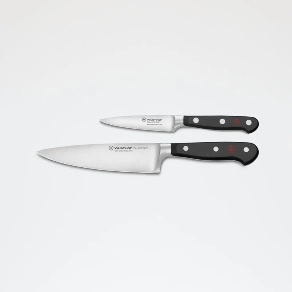 The perfect partner to expressive cuisine, this set of red-handled knives complements your kitchen with beautiful color. Part of Wusthof's Classic series known for its durability and high quality, the 8-inch chef, 5-inch serrated utility and 3.5-inch paring knives form the basis of any cutlery collection. Each knife in the three-piece set is forged from a single piece of high-carbon stainless steel and finished with a long-lasting edge. Brass-riveted handles provide the full-tang knives with a comfortable handhold as well as a dash of earthy color inspired by sumac berries.Produced by skilled craftspeople in the knife-producing capital of the world, Wüsthof blades have been crafted in Solingen, Germany, for over 200 years.