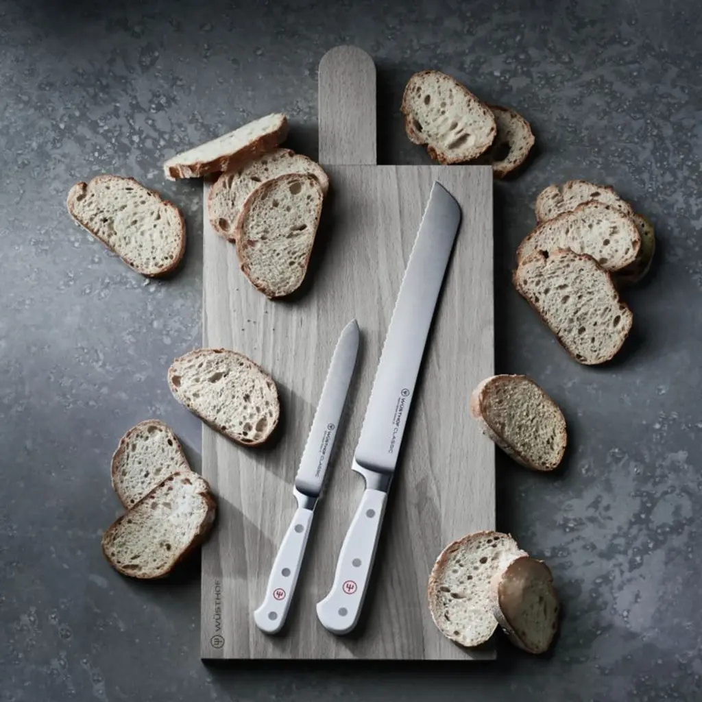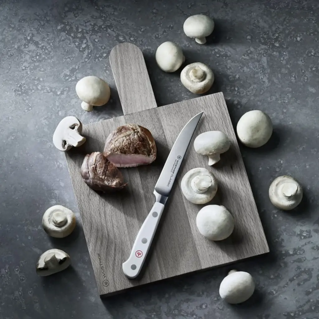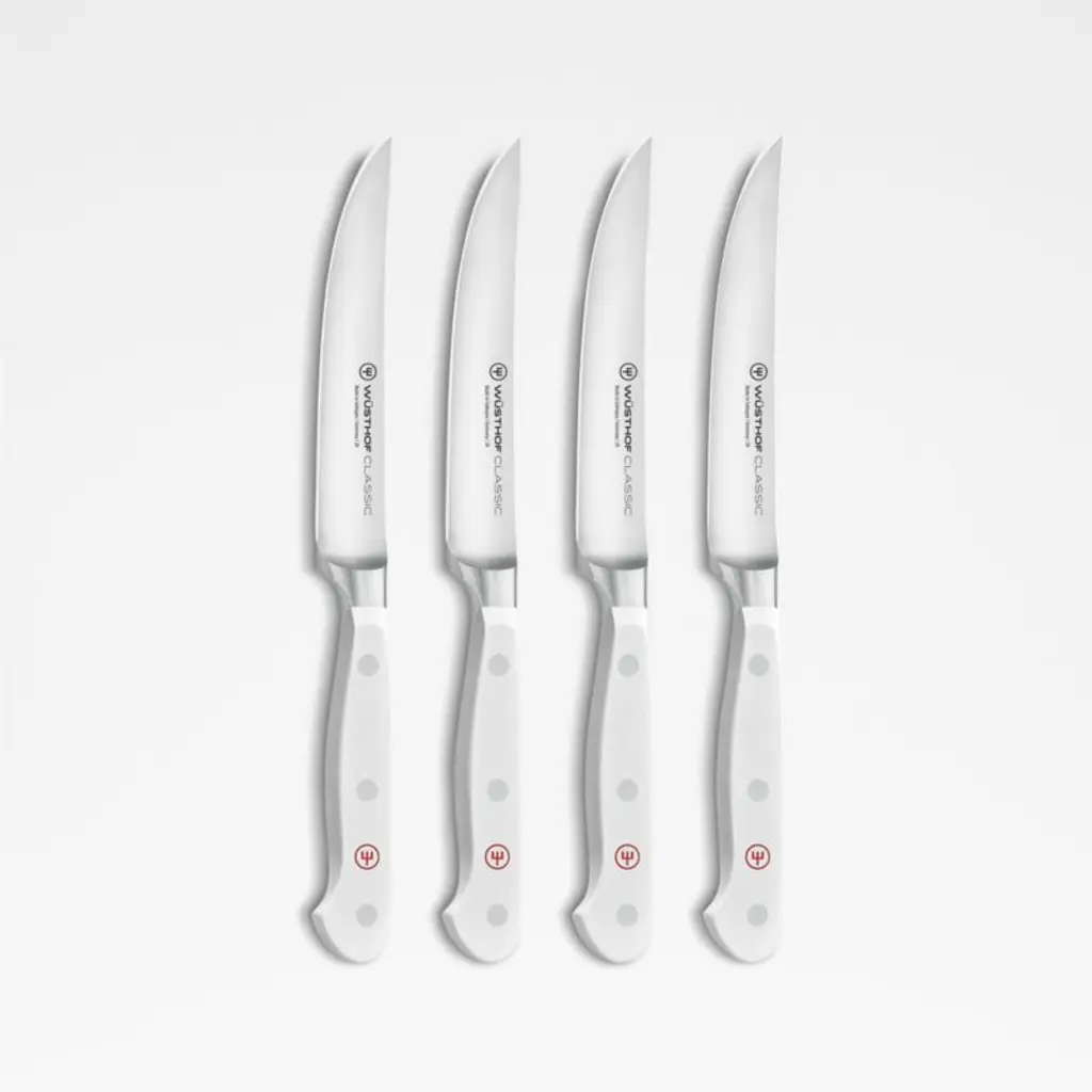 Designed in 1886, the Wüsthof's Classic series epitomizes quality and durability. Precision-forged knives feature hardened high-carbon steel blades with laser-controlled edges that are easy to sharpen. Ergonomic, triple-riveted white synthetic handlesmore sanitary than woodprovide a comfortable grip and precise control. The gorgeously grained acacia wood block has a great countertop presence, with extra slots for new additions. An excellent housewarming, graduation or wedding gift, this comprehensive 12-piece set includes a 3.5-inch paring knife, 6-inch utility knife, 6- and 8-inch chef knives, 9-inch double serrated bread knife, four 4.5-inch steak knives, 8.5-inch stainless steel kitchen shears and 9-inch brushed stainless steel honing steel in an acacia wood block.Produced by skilled craftspeople in the knife-producing capital of the world, Wüsthof blades have been crafted in Solingen, Germany, for over 200 years. Need help choosing? Here's your essential guide to choosing the best knifeView all Wüsthof Classic Cutlery