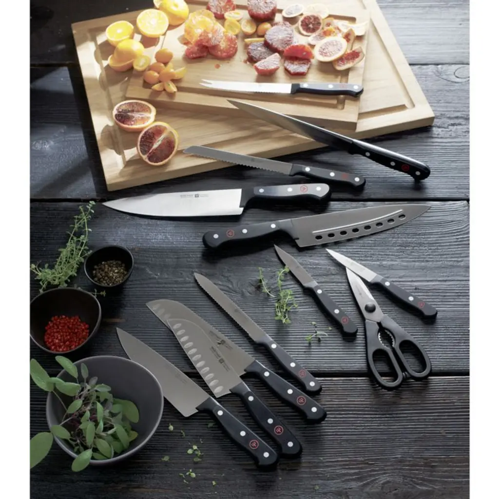 Add to your cutlery collection with this santoku knife. With its distinctive scalloped blade, the santoku is a Japanese chef's knife translating "three great things: slicing, dicing and mincing." Laser-cut non-forged blade is tempered and hardened steel with a long-lasting, V-ground edge. Full tang adds weight and balance. Synthetic handle is triple-riveted. High-carbon, no-stain blade is easy to sharpen.Produced by skilled craftspeople in the knife-producing capital of the world, Wüsthof blades have been crafted in Solingen, Germany, for over 200 years. Need help choosing? Here's your essential guide to choosing the best knifeView all Wusthof products Wüsthof and other Wedding Registry offers