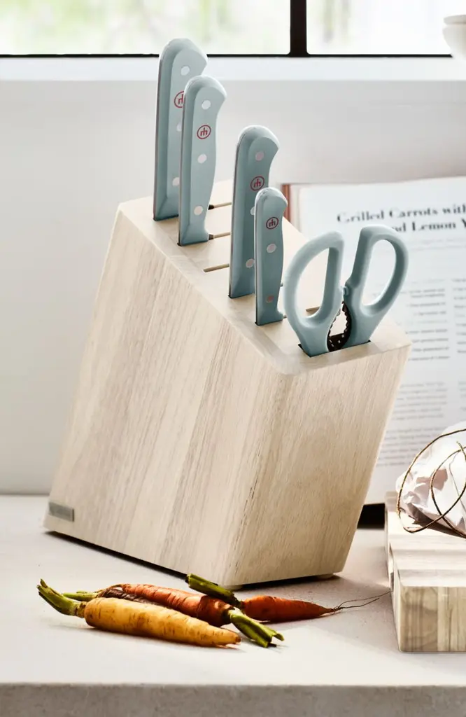 This charming knife block set brightens your countertopand every cutting taskwith powder blue-handled knives nestled in a whitewashed wooden block. The look is fresh, dreamy and only available at Crate & Barrel. One of the most trusted names in cutlery, Wüsthof offers a seat with the perfect knife for every cutting, chopping and slicing job. The high-carbon stainless steel blades feature laser-cut edges and full tangs for optimal weight and balance. Pastel blue synthetic handles are comfortable to hold and triple riveted for durability. This seven-piece set includes a 3-inch spear-point paring knife, 6-inch utility knife, 8-inch chef's knife, 8-inch bread knife, come-apart kitchen shears and two-stage sharpener in a 15-slot block with room to spare. For a fully coordinated kitchen and dining experience, pair blue Wusthof cutlery with utensils and table linens from our Marin Quiet Blue collection.Produced by skilled craftspeople in the knife-producing capital of the world, Wüsthof blades have been crafted in Solingen, Germany, for over 200 years.