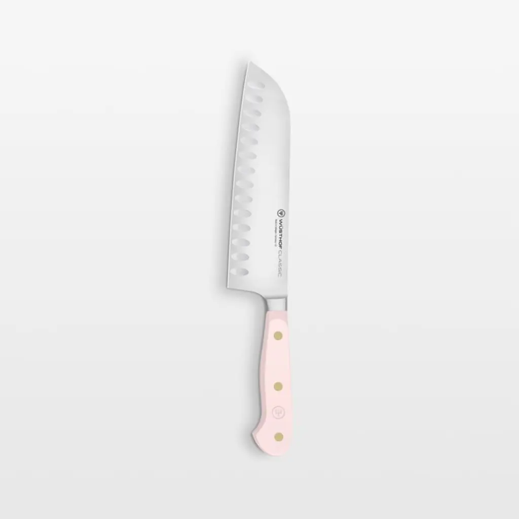 This charming knife brightens every cutting task with its powder blue handlethe look is fresh, dreamy and only available at Crate & Barrel. One of the most trusted names in cutlery, Wüsthof offers a high-carbon stainless steel santoku knife with a full tang for optimal weight and balance. The pastel blue synthetic handle is comfortable to hold and triple riveted for durability. Pair the versatile santoku knife with the other knives in this exclusive hue to create a custom set to suit your cooking style. For a fully coordinated kitchen and dining experience, pair blue Wusthof cutlery with utensils and table linens from our Marin Quiet Blue collection.Produced by skilled craftspeople in the knife-producing capital of the world, Wüsthof blades have been crafted in Solingen, Germany, for over 200 years.