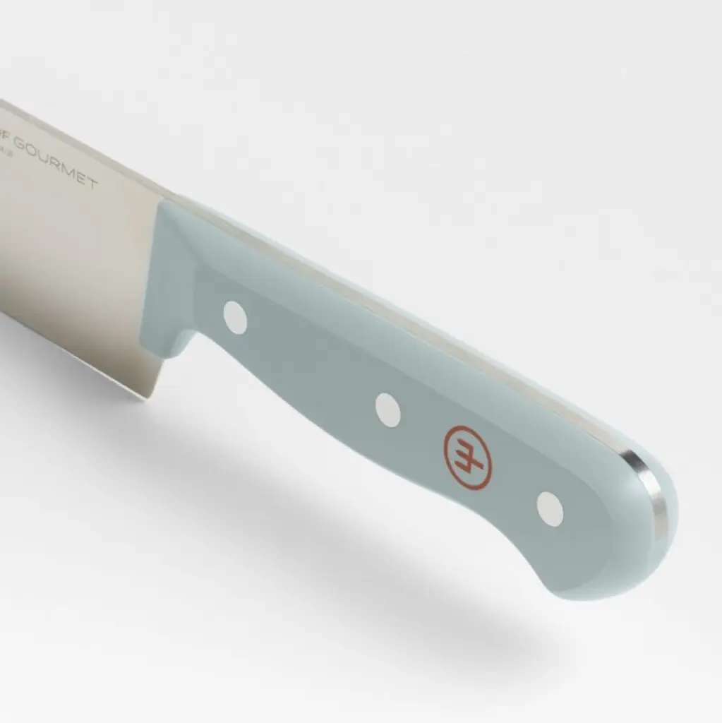 This charming knife brightens every cutting task with its powder blue handlethe look is fresh, dreamy and only available at Crate & Barrel. One of the most trusted names in cutlery, Wüsthof offers a high-carbon stainless steel chef's knife with a full tang for optimal weight and balance. The pastel blue synthetic handle is comfortable to hold and triple riveted for durability. Pair the all-purpose chef's knife with the other knives in this exclusive hue to create a custom set to suit your cooking style. For a fully coordinated kitchen and dining experience, pair blue Wusthof cutlery with utensils and table linens from our Marin Quiet Blue collection.Produced by skilled craftspeople in the knife-producing capital of the world, Wüsthof blades have been crafted in Solingen, Germany, for over 200 years.