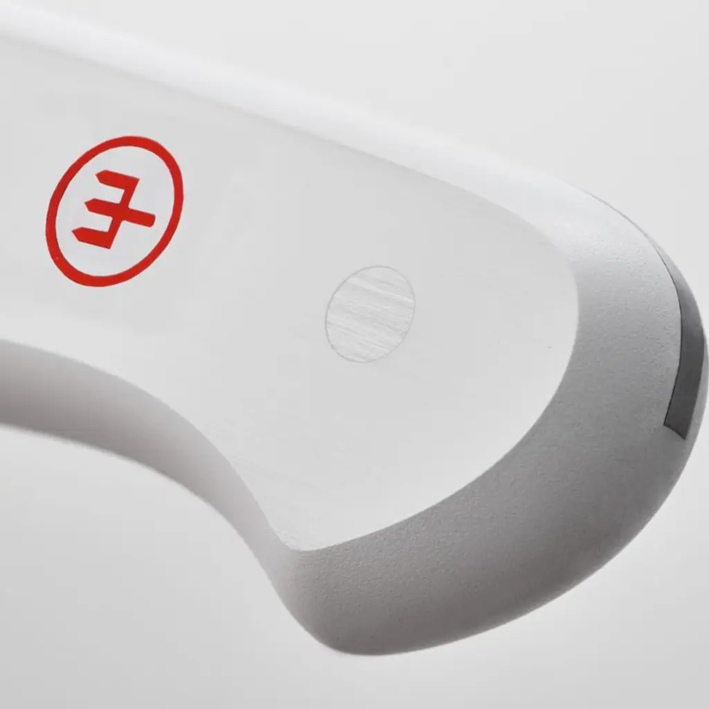 One of the most trusted names in cutlery, Wüsthof offers the perfect chef's knife for a wide variety of cutting tasks. The strong, long blade is stamped from a single piece of high-carbon steel with a full tang that adds weight and balance. Triple-riveted for durability, the white synthetic handle provides a comfortable grip on this essential knife as you slice, cut, chop and dice.Produced by skilled craftspeople in the knife-producing capital of the world, Wüsthof blades have been crafted in Solingen, Germany, for over 200 years.