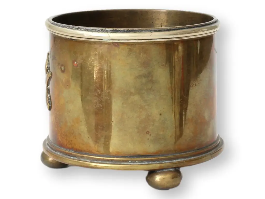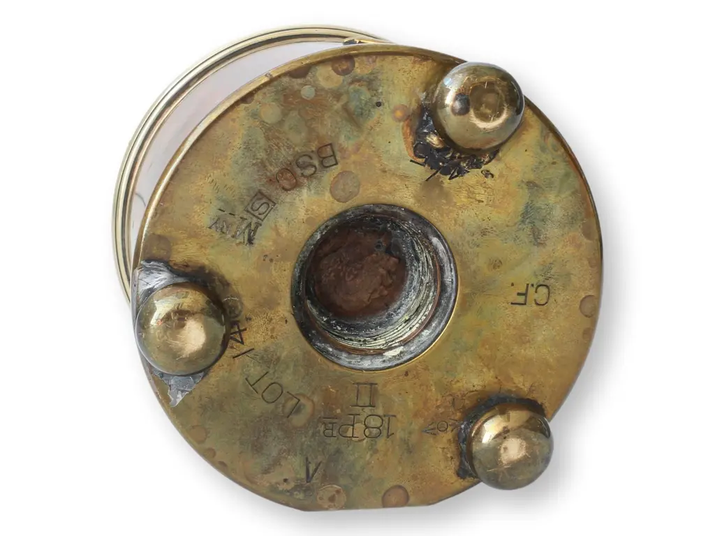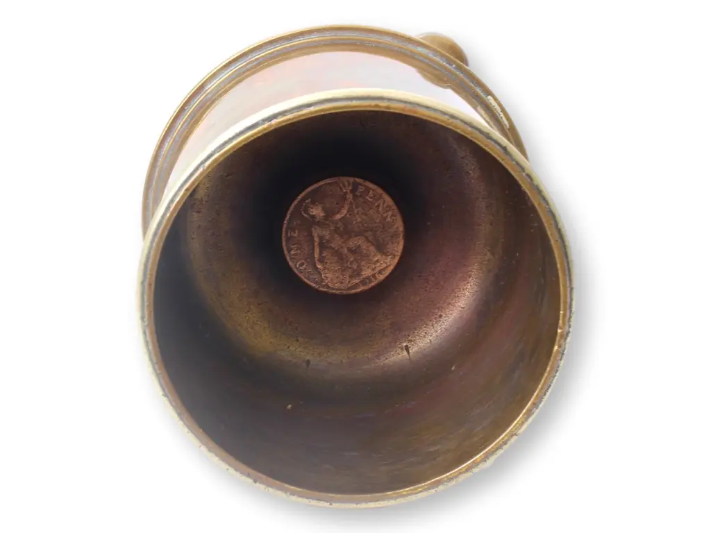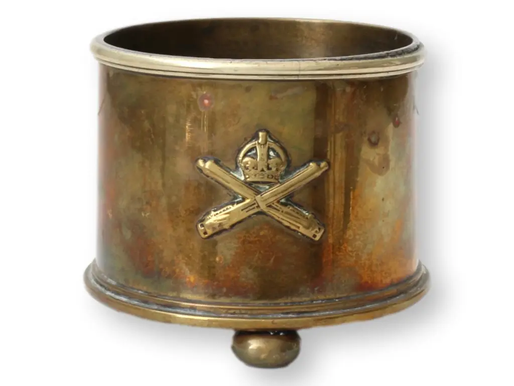 Unique WWI mortar trench art bottle coaster, an extraordinary piece crafted with a crown and a British 1916 penny embedded within its design. Likely made by an English prisoner of war, this rare artifact showcases the creativity and resourcefulness of soldiers during wartime. The intricate details and historical significance make it a remarkable addition to any military or trench art collection, embodying both craftsmanship and poignant history.