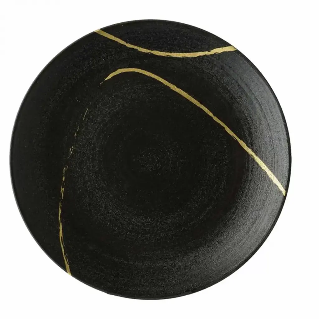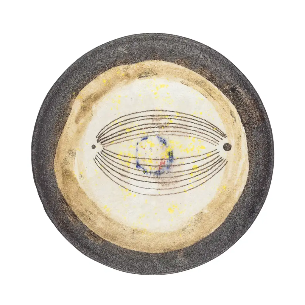 Minute red enamel brushstrokes trace the sinuous spike-like decorations on this round ceramic dinner plate. The shaded backdrop, obtained as a result of a deft manual painting process using non-toxic oxides, lends the plate a mysterious tone. It can be combined with other versions in the Artemest catalog for an original contemporary-style Christmas statement.