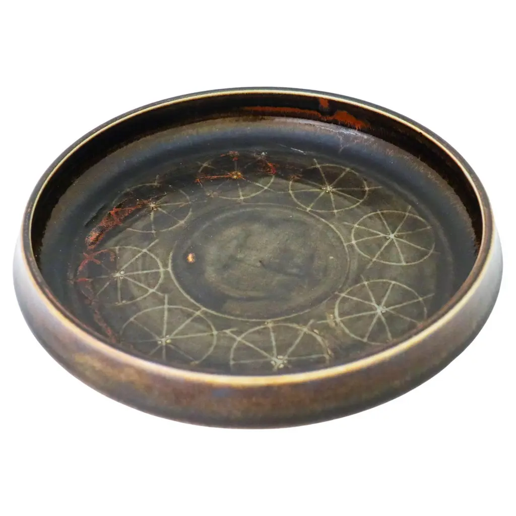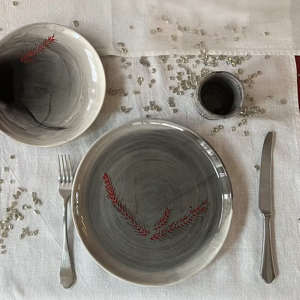 A delicate yet intriguing red enamel decoration reminiscent of spikes adorns this superb ceramic dinner plate from the Xmas Gio Collection. Deftly hand-painted with irregular dark brushstrokes using non-toxic oxides, it was decorated with the purpose of creating a singular piece able to accent contemporary festive tables. Other versions are available.