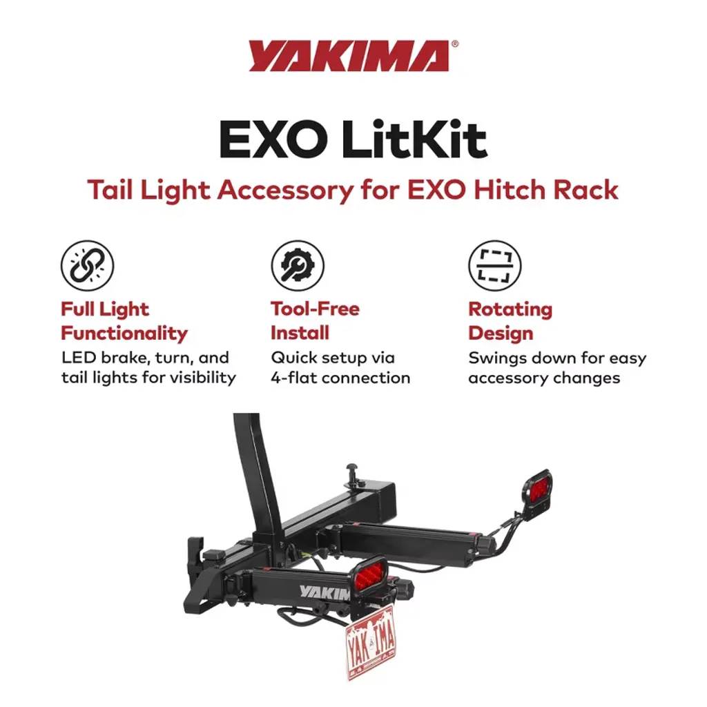 Enhance your road safety with the Yakima 5.4-Pound EXO LitKit featuring Tail Lights Accessory for the EXO Hitch Rack System. Ensure visibility during every journey with powerful LED taillights that boast full brake, turn signal, and lighting functionality. The clever design allows your lights and license plate to remain visible while on the road, promoting safety without compromising style. Effortless installation is at your fingertips with the tool-less setup compatible with the EXO SwingBase arms. This kit utilizes a 4-flat electrical connection and comes complete with all the necessary wiring to seamlessly connect to your vehicle's wiring harness. No need to worry about complicated installations so you can enjoy a hassle-free process and hit the road with confidence. Also, it comes with attachment points that enable the EXO LitKit to rotate down and out of the way. This feature allows you to easily switch between EXO accessories, providing flexibility and convenience tailored to your needs. The flexible license plate attachment adds an extra layer of protection, ensuring your plate remains unscathed even on steep driveways. Designed to be compatible with all US and Canada plates, the EXO LitKit is a universal solution for your road safety needs. It's important to note that the EXO LitKit is not intended to remain installed when Swing plate arms are closed, emphasizing its compatibility with the EXO SwingBase exclusively. Experience the road with confidence, knowing that your lights and license plate are visible, protected, and ready for any adventure. Illuminate your journeys and make safety a priority with the 5.4-Pound EXO LitKit from Yakima, the reliable addition for your EXO Hitch Rack System.