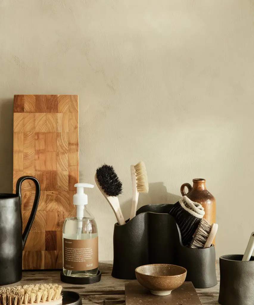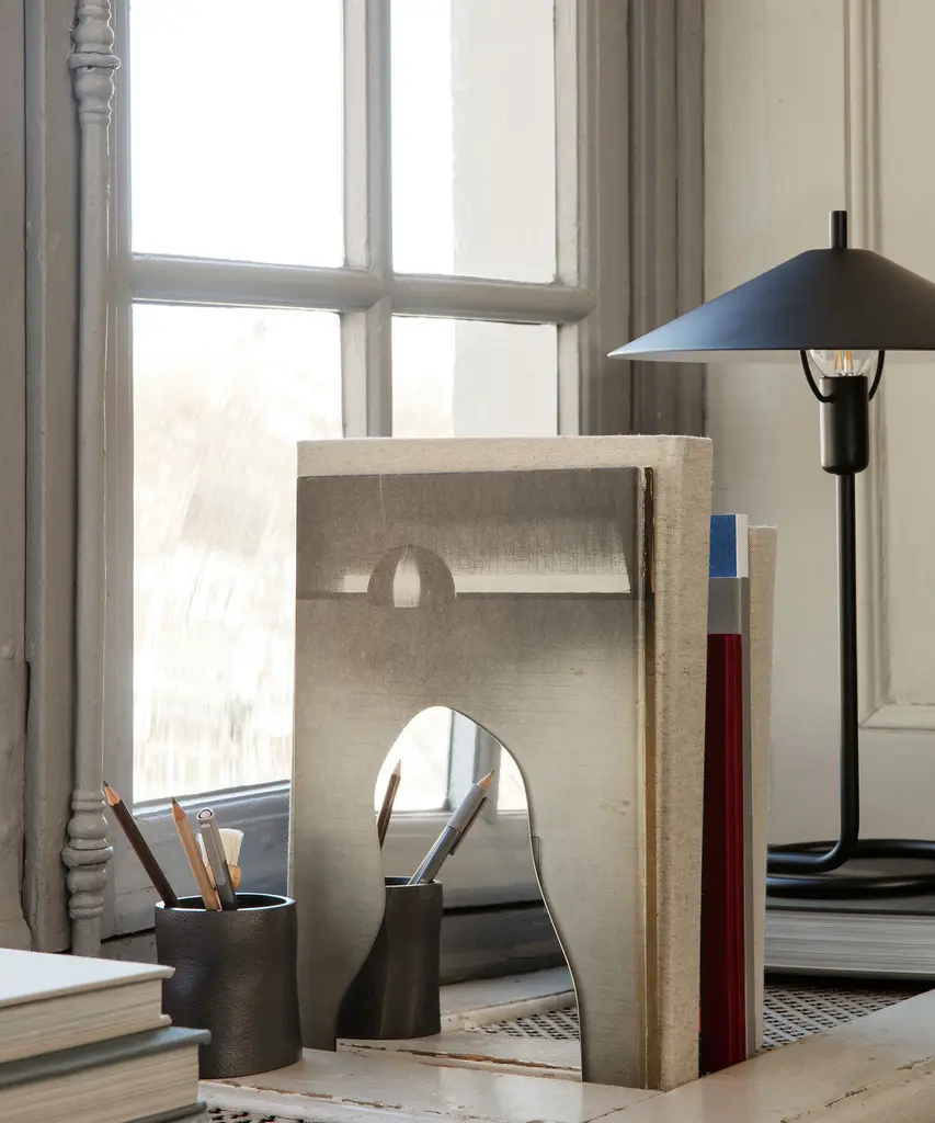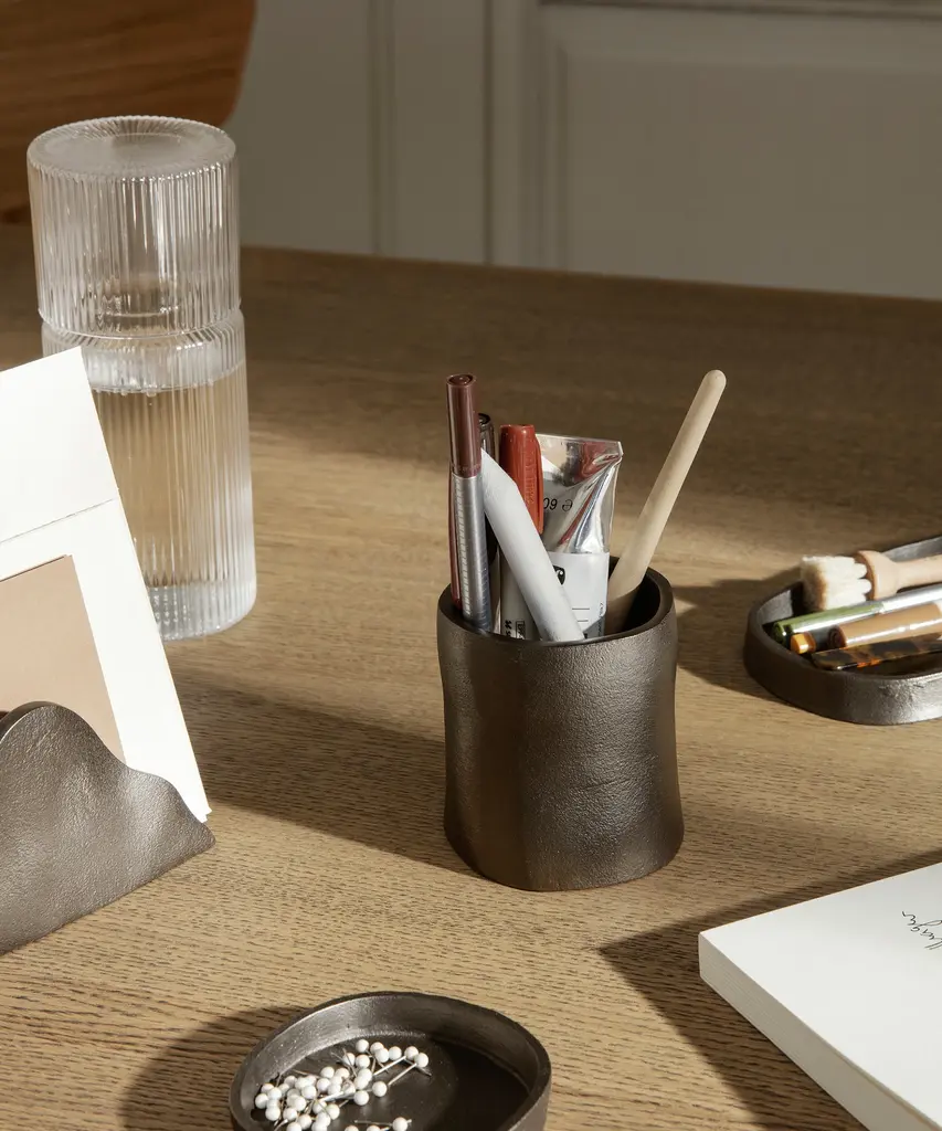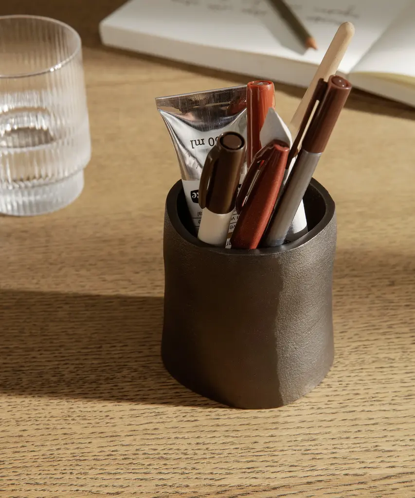 Named after the Japanese word for mountain, the Yama Cup is a sculptural yet functional piece that is inspired by wild, untamed landscapes. Made from recycled casted aluminium and featuring a rough, matte, and blackened finish that contrasts its fluid and organic silhouette, the decorative cup is ideal for storing pens and pencils in your home office or for makeup and other daily essentials in the bathroom. Fits inside the Yama Tray Oval. Designed and produced by the Copenhagen-based studio Ferm Living.