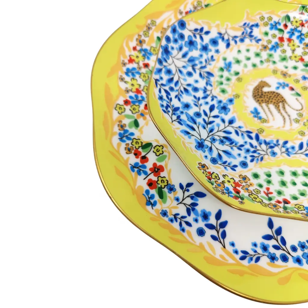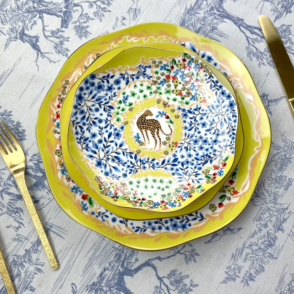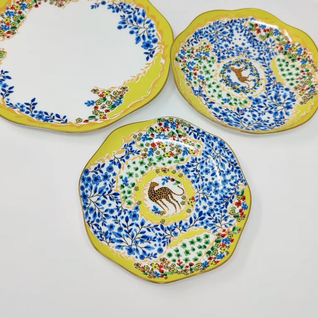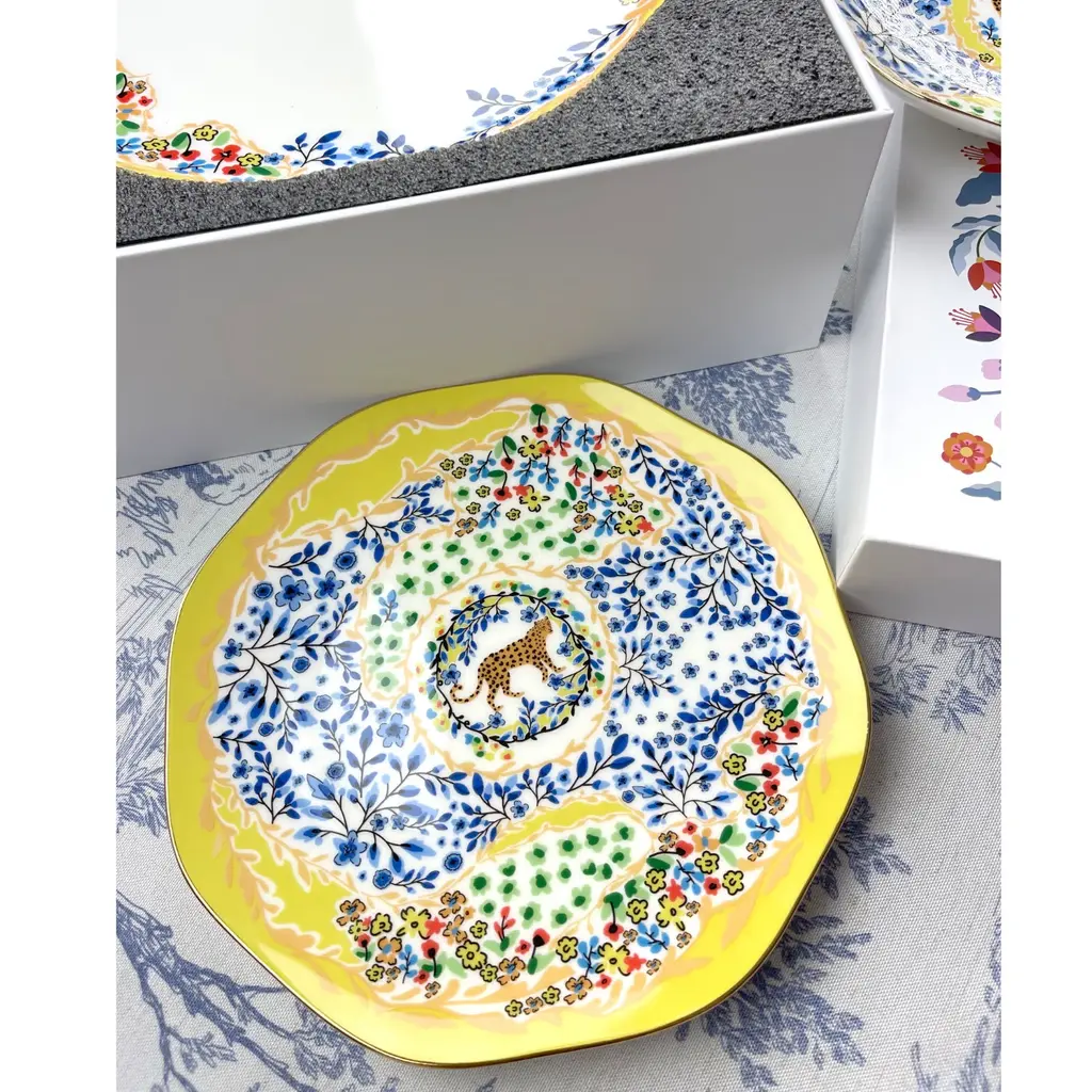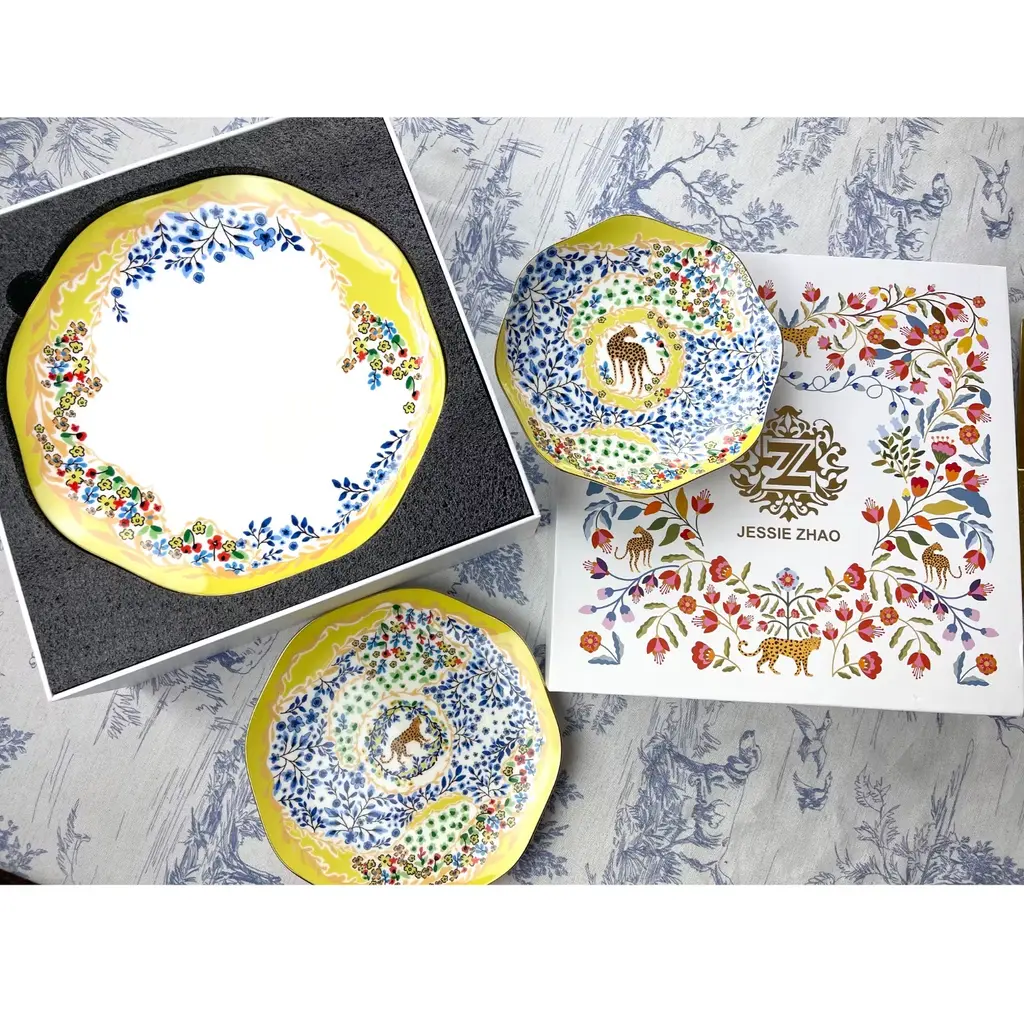 This set of bone china three-piece plates with a yellow garden design was inspired by a backyard garden on a sunny afternoon, with scattered blue floral patterns set against the yellow sunlight. The plates are embellished with animals, showcasing the harmony between humans and nature. Bright gold banding looks fantastic and provides superior strength. Starters, sides, or sweets, true luxury is about following your intuition. Rich in color, print and personality, this design will spark your imagination and add a pop of inspiring color and bold pattern to your table. Presented in our signature JZ gift box.