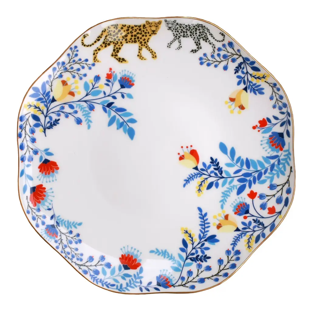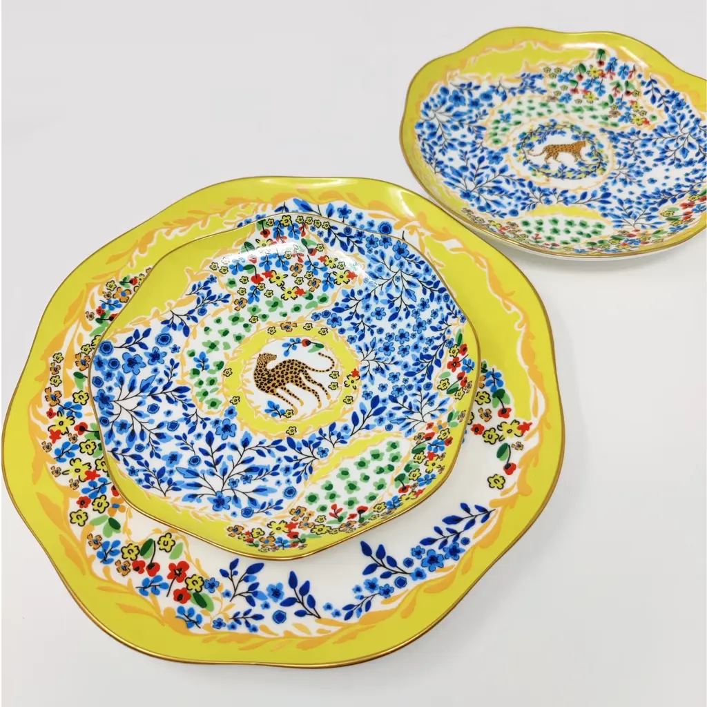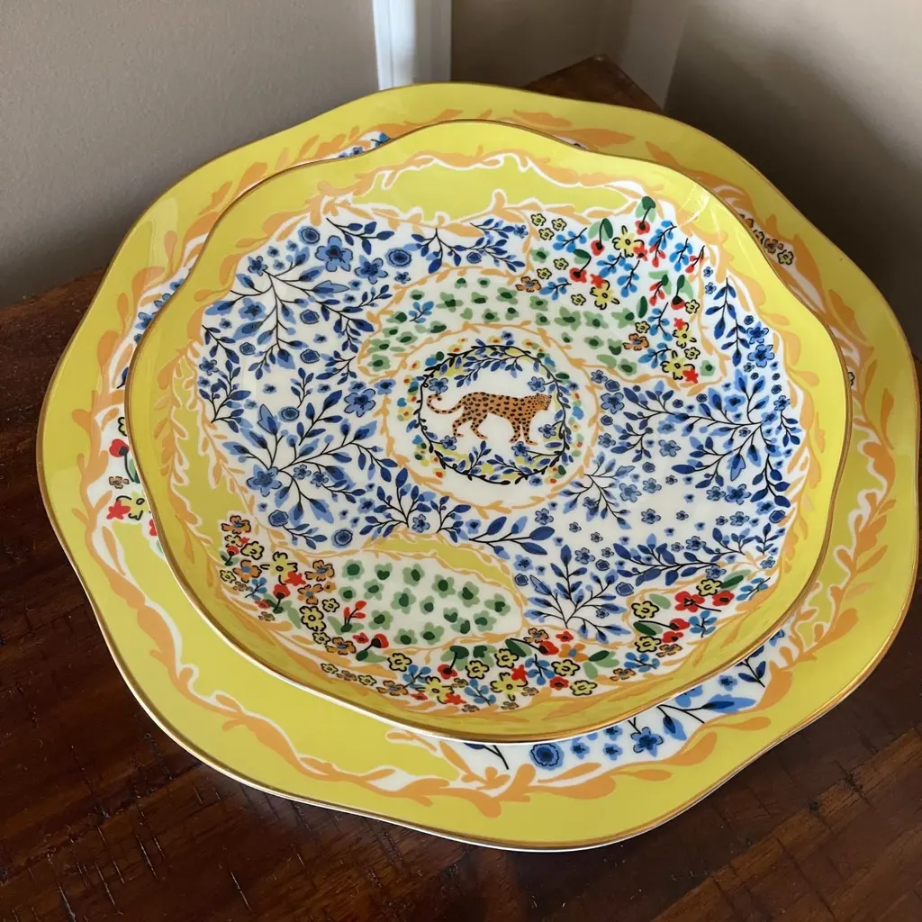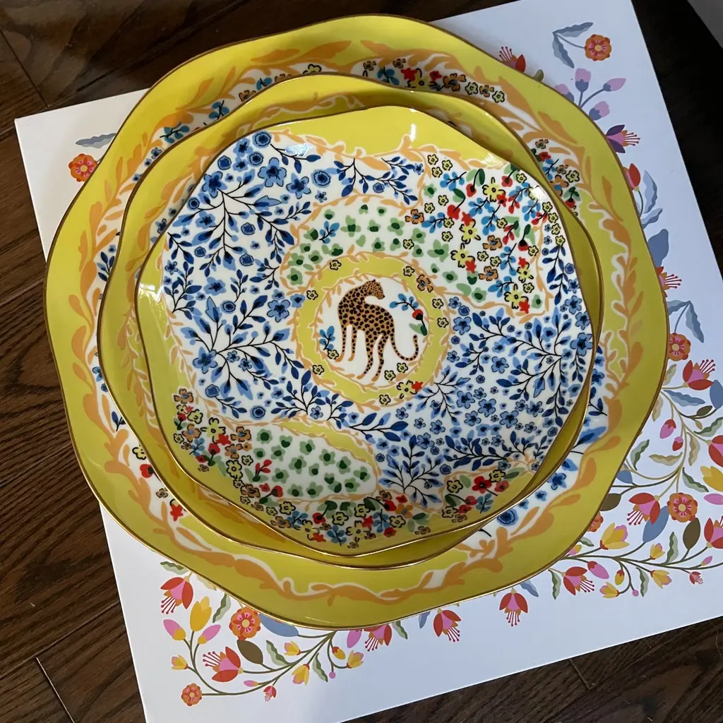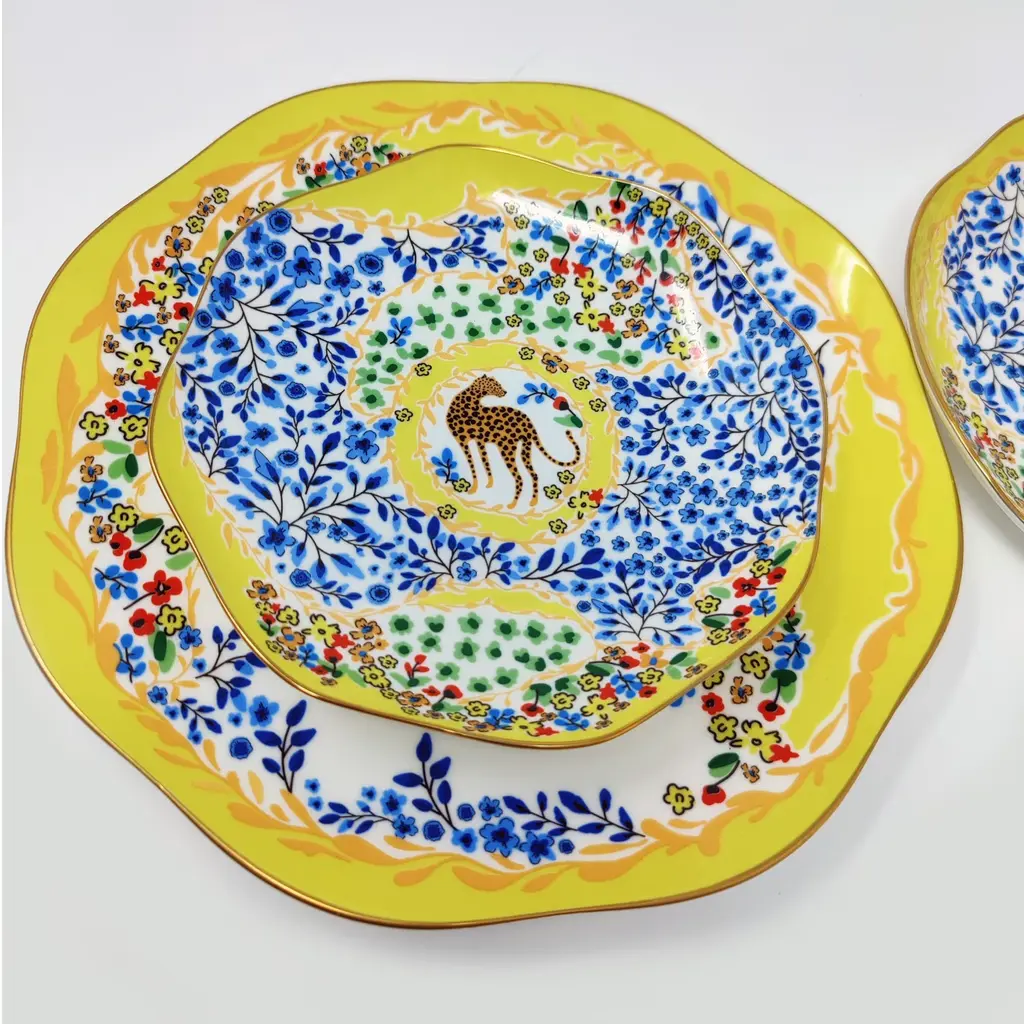 This set of bone china three-piece plates with a yellow garden design was inspired by a backyard garden on a sunny afternoon, with scattered blue floral patterns set against the yellow sunlight. The plates are embellished with animals, showcasing the harmony between humans and nature. Bright gold banding looks fantastic and provides superior strength. Starters, sides, or sweets, true luxury is about following your intuition. Rich in color, print and personality, this design will spark your imagination and add a pop of inspiring color and bold pattern to your table. Presented in our signature JZ gift box.