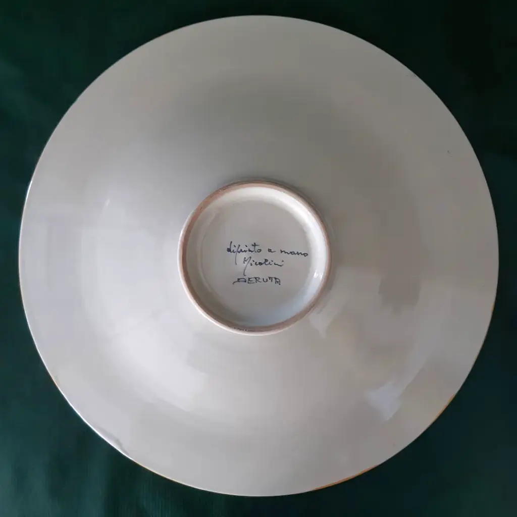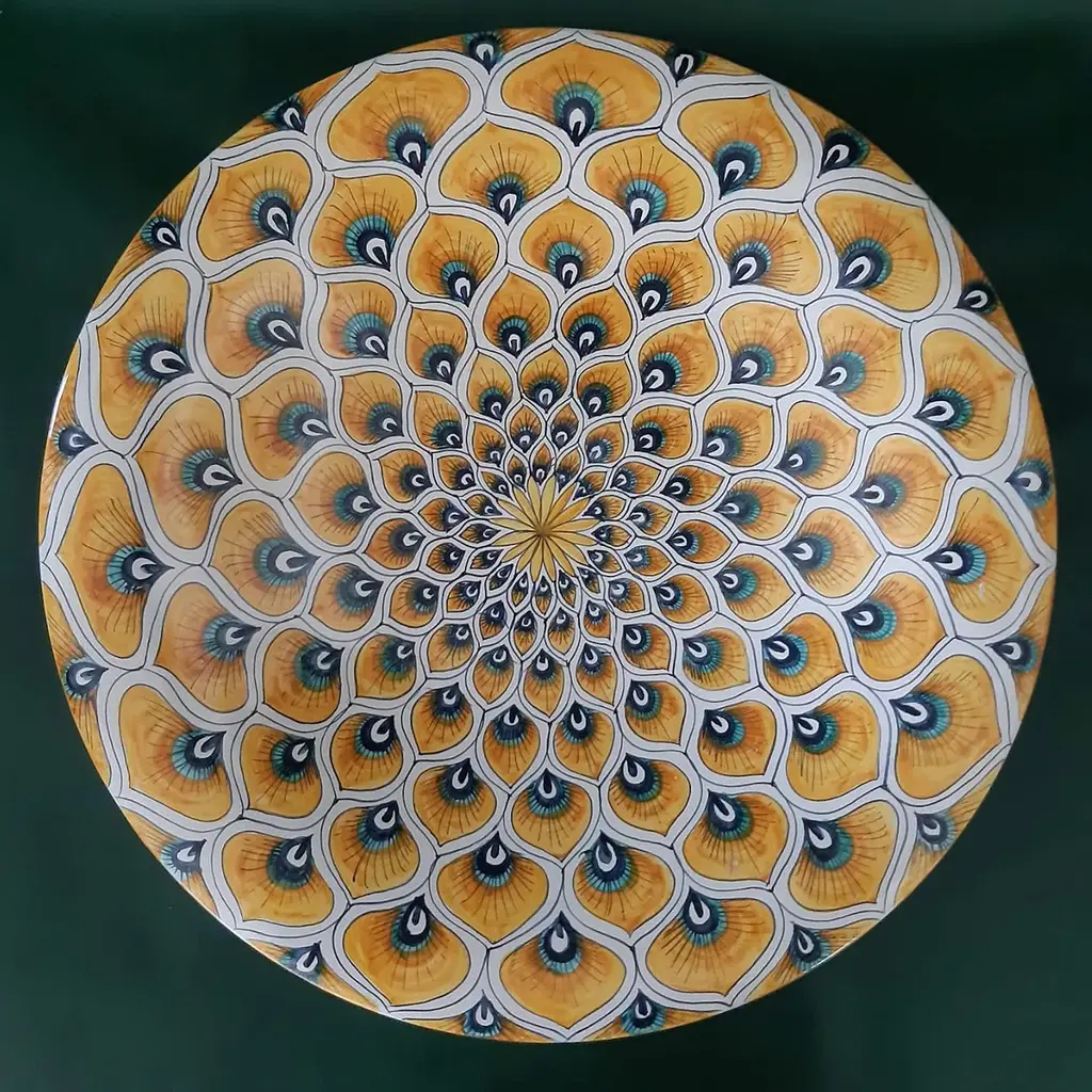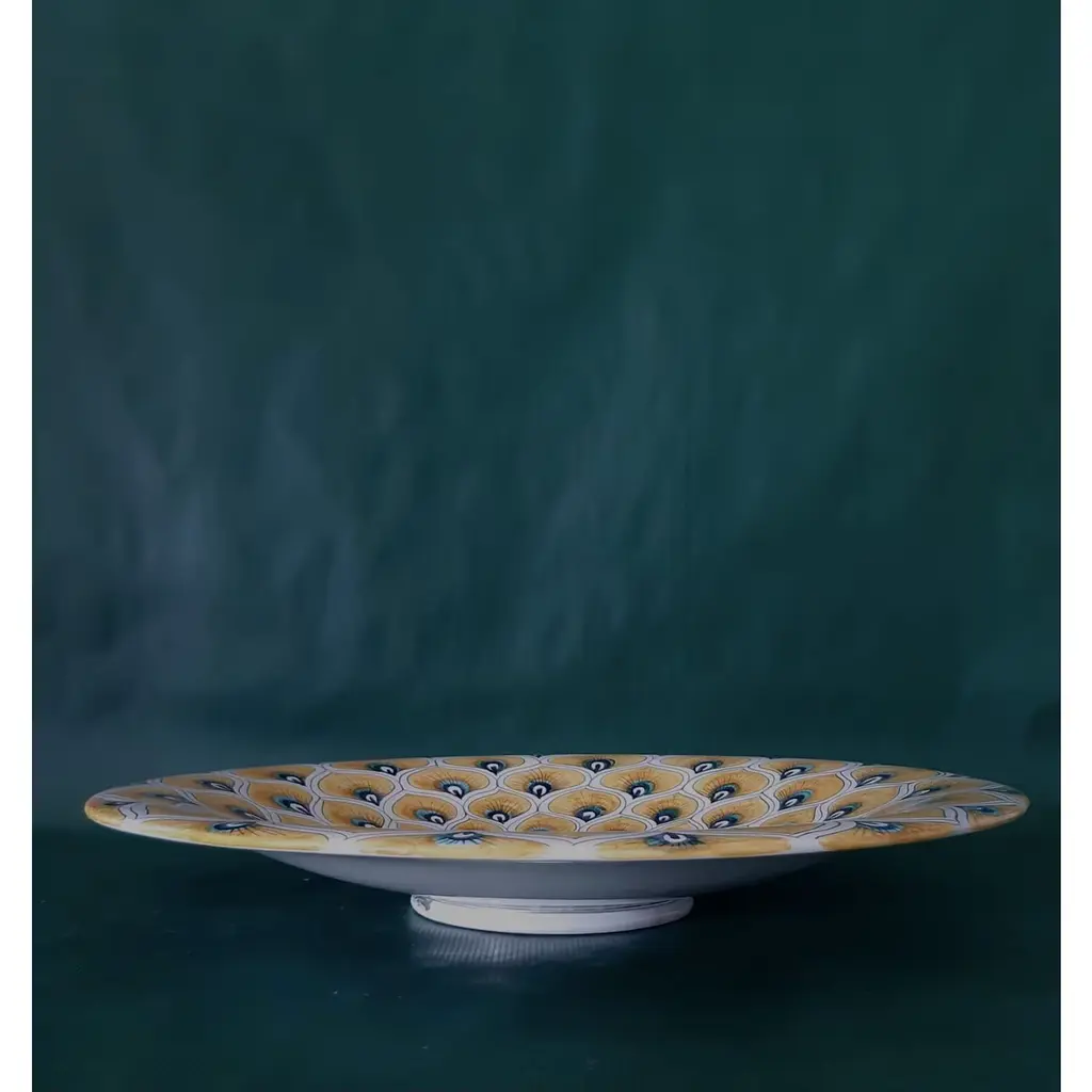 A true show-stopper boasting the allure of an unrepeatable objet d'art, this decorative round plate (⌀ 40cm) belongs to the Yellow Peacock Feather Collection, counting unique pieces designed and handcrafted by master ceramist Maria Rita Nicolini. A mantle of yellow peacock feathers is painted in a radial motif, enchanting with their detailed aesthetic and mesmerizing hues ranging from deep-blue to ocher. The piece can be hung on walls alongside plates in other sizes for a cohesive look.