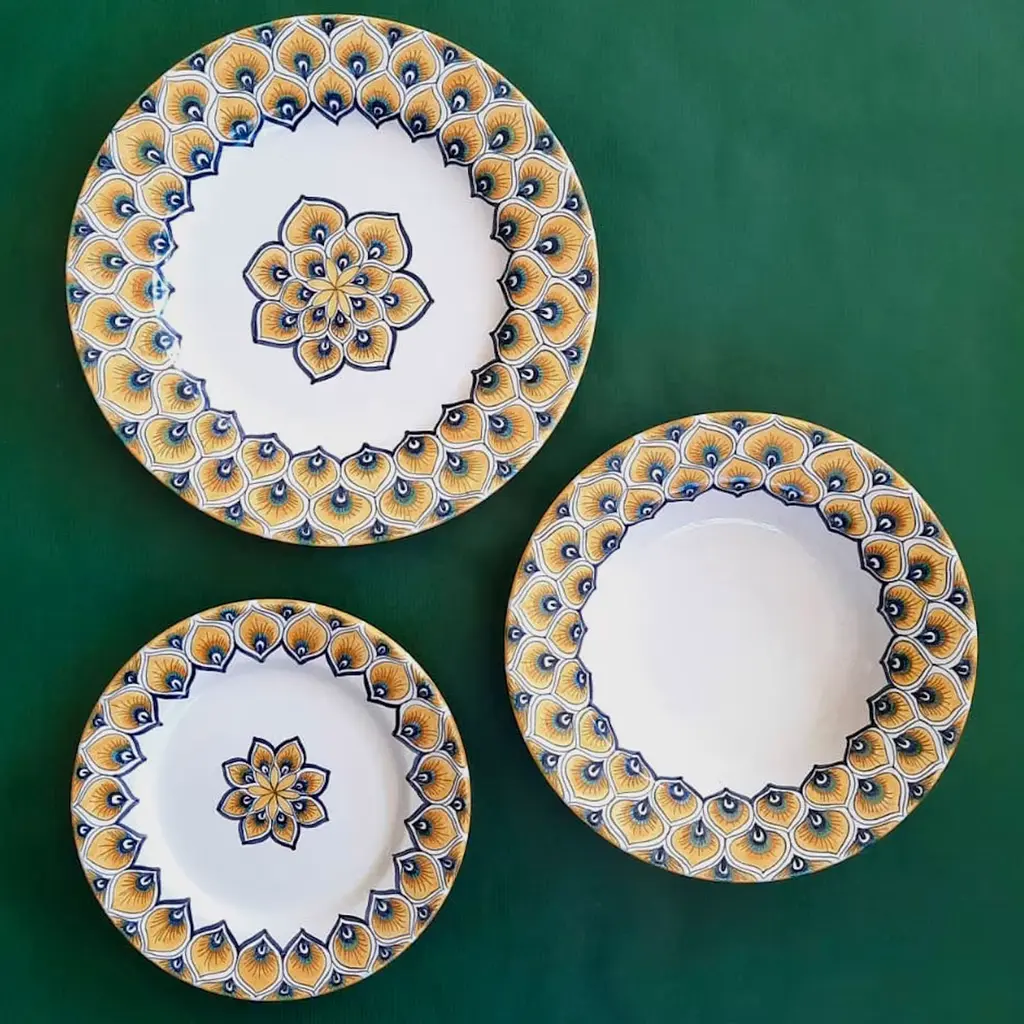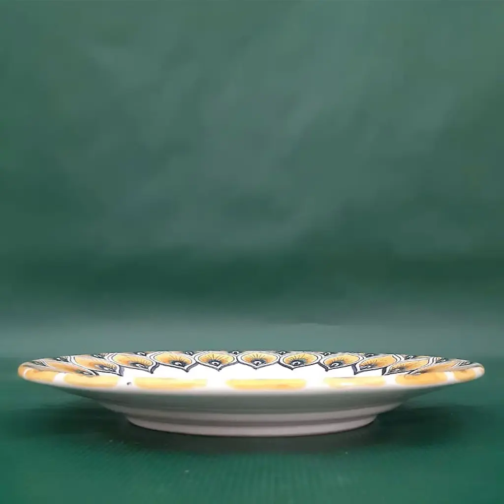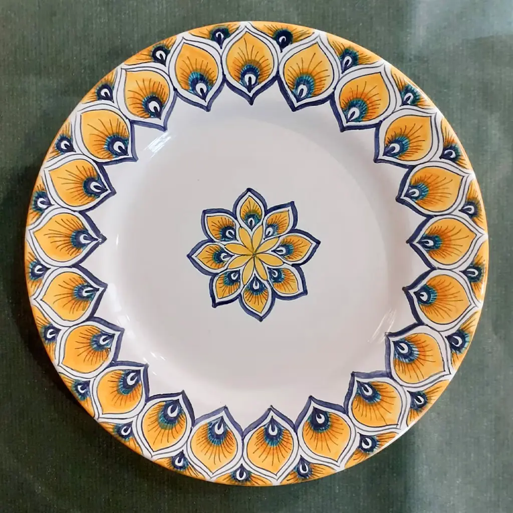 Master ceramist Maria Rita Nicolini handcrafted this one-of-a-kind dessert plate from the Yellow Peacock Collection, adorning it with her signature motif of delightful peacock feather painted in vibrant tones of blue and yellow for a striking chromatic look that will surely elevate any table setting. The feathers adorn the center and the rim, seemingly embracing the dessert placed within. The piece can be combined with twins and with dinner plates from the same series for a coordinated look.